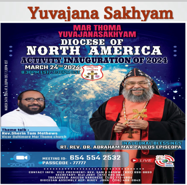 ന്യൂയോർക് :നോർത്ത് അമേരിക്ക ഭദ്രാസന മാർ തോമ യുവജന സഖ്യം 2024-ലെ പ്രവർത്തന ഉദ്ഘാടനം മാർച്ച് 24നു വെള്ളിയാഴ്ച 8.30PM EST/7:30PM സൂം ഫ്ലാറ്റ് ഫോമിൽ വെച്ച് നടക്കുന്നു .ഭദ്രാസന എപ്പിസ്കോപ്പ റൈറ്റ് . റവ ഡോ എബ്രഹാം മാർ പൗലോസ് എപ്പിസ്കോപ്പ ഉദ്ഘാടനം നിർവഹിക്കുന്ന സമ്മേളനത്തിൽ റവ.ഷെറിൻ ടോം മാത്യൂസ് (വികാരി ബാൾട്ടിമോർ മാർത്തോമ്മാ പള്ളി) തീം ടോക്ക് നടത്തും.സമ്മേളനത്തിൽ ഭദ്രാസനത്തിലെ എല്ലാ യുവജനങ്ങളും പ്രാർത്ഥനാപൂർവ്വം പങ്കെടുക്കണമെന്ന് സംഘാടകർ അഭ്യത്ഥിച്ചു