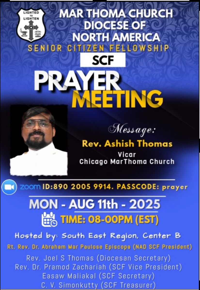 ന്യൂയോർക് :നോർത്ത് അമേരിക്ക മാർത്തോമ്മാ ഭദ്രാസനം സീനിയർ സിറ്റിസൺ ഫെലോഷിപ്പിന്റെ ആഭിമുഖ്യത്തിൽ ആഗസ്റ് 11 നു തിങ്കൾ രാത്രി 8-00 (ഇഎസ്ടി) സൂം പ്ലാറ്റഫോമിൽ പ്രയർ മീറ്റിംഗ് സംഘടിപ്പിക്കുന്നു.