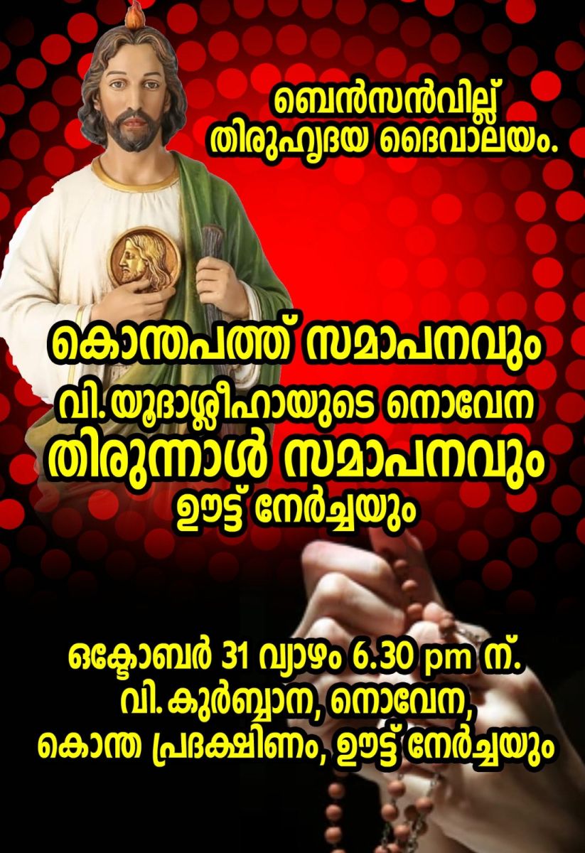 ചിക്കാഗോ: ബെൻസൻവിൽ തിരുഹൃദയ ഫൊറോനാ പള്ളിയിൽ പത്തുദിനങ്ങൾനീളുന്ന കൊന്തപ്പത്തും വിശുദ്ധ യൂദാശ്ലീഹായുടെ നൊവേന തിരുനാളും