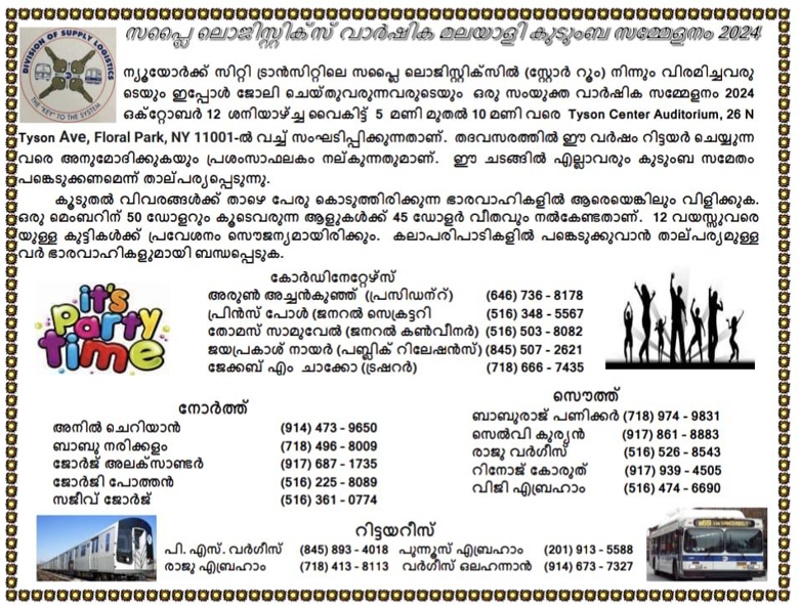 ന്യൂയോർക്ക്: ന്യൂയോർക്ക് സിറ്റി ട്രാൻസിറ്റിലെ സപ്ലൈ ലൊജിസ്റ്റിക്സിലുള്ള മലയാളികളായ ഉദ്യോഗസ്ഥന്മാരുടെയും, സർവീസിൽ നിന്ന് പിരിഞ്ഞു പോയവരുടെയും കുടുംബ സംഗമം 2024 ഒക്ടോബർ 12 ശനിയാഴ്ച്ച വൈകിട്ട് 5 മണിമുതൽ ഫ്ലോറൽ പാർക്കിലെ 26 നോർത്ത് ടൈസൺ അവന്യുവിലുള്ള ടൈസൺ സെന്റർ ഓഡിറ്റോറിയത്തിൽ വച്ച് നടക്കുന്നതാണ്. കഴിഞ്ഞ സംഗമത്തിനു ശേഷം സർവീസിൽ നിന്നും വിരമിച്ചവരെ ഈ സംഗമത്തിൽ വച്ച് ആദരിക്കുവാനും പ്രശംസാ ഫലകം നൽകാനുമാണ് ഉദ്ദേശിക്കുന്നത്. അതിനുവേണ്ടി സർവീസിൽ നിന്ന് വിരമിച്ചവരുടെ വിശദവിവരം അറിയിക്കണമെന്ന് പ്രസിഡന്റ് അരുൺ അച്ചൻകുഞ്ഞ് അഭ്യർത്ഥിച്ചു. കൂടുതൽ വിവരങ്ങൾക്ക് ഇതോടൊപ്പം കൊടുത്തിരിക്കുന്ന ഫ്ലയർ കാണുക.