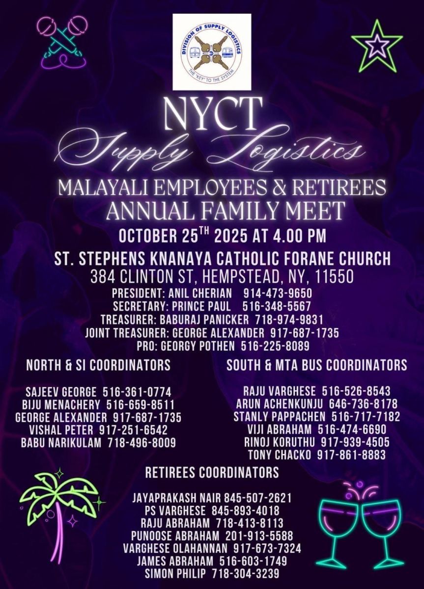 ന്യൂയോർക്ക്: ന്യൂയോർക്ക് സിറ്റി ട്രാൻസിറ്റിലെ സപ്ലൈ ലൊജിസ്റ്റിക്സിലുള്ള മലയാളികളായ ഉദ്യോഗസ്ഥരുടെയും, സർവീസിൽ നിന്ന് പിരിഞ്ഞു പോയവരുടെയും “കുടുംബ സംഗമം“ 2025 ഒക്ടോബർ 25 ശനിയാഴ്ച്ച വൈകിട്ട് 4 മണി മുതൽ ഹെംസ്റ്റെഡിലെ സെന്റ് സ്റ്റീഫൻസ് ക്നാനായ കാത്തലിക് ഫൊറേൻ ചർച്ച് (384 Clinton Street, Hempstead, NY 11550) ഓഡിറ്റോറിയത്തിൽ വച്ച് നടക്കുന്നതാണ്. കഴിഞ്ഞ സംഗമത്തിനു ശേഷം സർവീസിൽ നിന്നും വിരമിച്ചവരെ ഈ സംഗമത്തിൽ വച്ച് ആദരിക്കുവാനും പ്രശംസാ ഫലകം നൽകാനുമാണ് ഉദ്ദേശിക്കുന്നത്. അതിനുവേണ്ടി സർവീസിൽ നിന്ന് വിരമിച്ചവരുടെ വിശദവിവരം അറിയിക്കണമെന്ന് പ്രസിഡന്റ് അനിൽ ചെറിയാൻ അഭ്യർത്ഥിക്കുന്നു. കൂടുതൽ വിവരങ്ങൾക്ക് ഇതോടൊപ്പം കൊടുത്തിരിക്കുന്ന ഫ്ലയർ കാണുക.