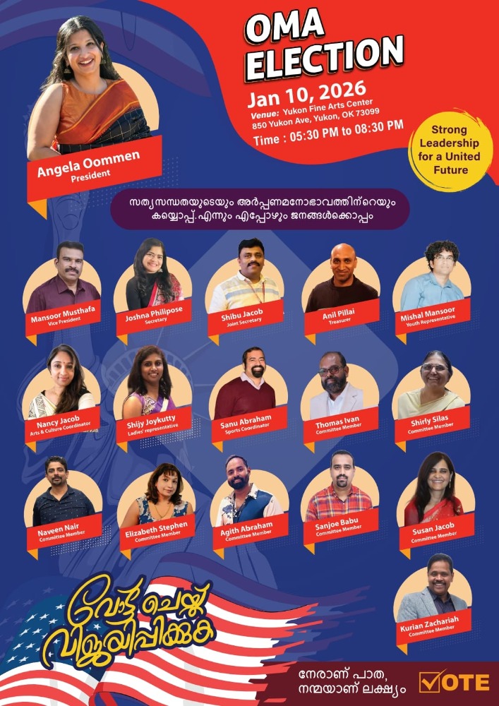 ഒക്ലഹോമ സിറ്റി:ആഞ്ചല ഉമ്മന്റെ നേതൃത്വത്തിലുള്ള ചലനാത്മക പാനലിന്റെ കീഴിൽ ഒക്ലഹോമ മലയാളി അസോസിയേഷൻ (ഒഎംഎ) അഭിമാനത്തോടെ ഒരു പുതുക്കിയ ദർശനവും നേതൃത്വ ദിശയും പ്രഖ്യാപിക്കുന്നു, ഇത് ഒക്ലഹോമയിലെ മലയാളി സമൂഹത്തിന് ആവേശകരമായ ഒരു പുതിയ അധ്യായം അടയാളപ്പെടുത്തുന്നു. "യുണൈറ്റഡ് ഫ്യൂച്ചർ" എന്ന ശക്തമായ മുദ്രാവാക്യത്താൽ നയിക്കപ്പെടുന്ന പുതിയ നേതൃത്വ പാനൽ, എല്ലാ പ്രായത്തിലുമുള്ള, പശ്ചാത്തലങ്ങളിലെയും താൽപ്പര്യങ്ങളിലെയും അംഗങ്ങളെ ഒരുമിച്ച് കൊണ്ടുവരുന്ന, എല്ലാവരെയും ഉൾക്കൊള്ളുന്നതും, ഊർജ്ജസ്വലവും, ഭാവിയെക്കുറിച്ചുള്ളതുമായ ഒരു സംഘടന കെട്ടിപ്പടുക്കാൻ പ്രതിജ്ഞാബദ്ധമാണ്. എല്ലാ അംഗങ്ങളുടെയും പൂർണ്ണ പങ്കാളിത്തത്തിൽ ശ്രദ്ധ കേന്ദ്രീകരിക്കുന്നു, സമൂഹത്തിനുള്ളിൽ ശക്തമായ ഒരു സ്വത്വബോധവും തികഞ്ഞ ഉന്നമന ലക്ഷ്യവും വളർത്തിയെടുക്കുന്നു. സാംസ്കാരിക സംരക്ഷണത്തിനും വിദ്യാഭ്യാസ വികസനത്തിനുമുള്ള ആഴത്തിലുള്ള പ്രതിബദ്ധതയാണ് ഈ സംരംഭത്തിന്റെ കാതൽ. കേരളത്തിന്റെ സമ്പന്നമായ പൈതൃകത്തെ ആഘോഷിക്കുന്ന സാംസ്കാരിക പരിപാടികൾ ശക്തിപ്പെടുത്താനും വ്യക്തിഗത വളർച്ച, നേതൃത്വം, സമൂഹ ഇടപെടൽ എന്നിവയെ പിന്തുണയ്ക്കുന്ന അർത്ഥവത്തായ വിദ്യാഭ്യാസ അവസരങ്ങൾ സൃഷ്ടിക്കാനും അസോസിയേഷൻ പദ്ധതിയിടുന്നു. പുതിയ ദർശനത്തിന്റെ പ്രധാന ലക്ഷ്യം യുവാക്കളെ മുഖ്യധാരയിലേക്ക് ക്ഷണിക്കുകയും ശാക്തീകരിക്കുകയും ചെയ്യുക, സംഘടനയുടെ ഭാവിയെ നയിക്കാനും നവീകരിക്കാനും രൂപപ്പെടുത്താനുമുള്ള വേദികൾ അവർക്ക് നൽകുക എന്നതാണ്. പരിചയസമ്പന്നരായ നേതാക്കൾക്കൊപ്പം യുവശബ്ദങ്ങളെ പരിപോഷിപ്പിച്ചുകൊണ്ട്, വരും തലമുറകൾക്കായി സന്തുലിതവും സുസ്ഥിരവുമായ ഒരു സമൂഹം സൃഷ്ടിക്കാൻ OMA ലക്ഷ്യമിടുന്നു.മുതിർന്നവരെ ഉൾപ്പെടുത്തുന്നതിലും കുടുംബ കേന്ദ്രീകൃത പരിപാടികൾ വികസിപ്പിക്കുന്നതിലും അസോസിയേഷന്റെ സമർപ്പണവും ഒരുപോലെ പ്രധാനമാണ്, ഓരോ അംഗവും - മുതിർന്നവർ മുതൽ യുവ കുടുംബങ്ങൾ വരെ - വിലമതിക്കപ്പെടുന്നു, ബഹുമാനിക്കപ്പെടുന്നു, സജീവമായി ഇടപെടുന്നു എന്ന് ഉറപ്പാക്കുന്നു. ബന്ധം, ക്ഷേമം, തലമുറകൾ തമ്മിലുള്ള ബന്ധം എന്നിവ പ്രോത്സാഹിപ്പിക്കുന്നതിനായി രൂപകൽപ്പന ചെയ്ത പരിപാടികൾ വരാനിരിക്കുന്ന സംരംഭങ്ങളുടെ ഒരു നാഴികകല്ലായിരിക്കും .യുണൈറ്റഡ് ഫ്യൂച്ചർ ഒരു മുദ്രാവാക്യത്തേക്കാൾ കൂടുതലാണ് - അത് ഒരു വാഗ്ദാനമാണ്,” പാനൽ ലീഡ് ആഞ്ചല ഉമ്മൻ പറഞ്ഞു. “നമ്മുടെ സമൂഹത്തിലെ ഓരോ അംഗത്തെയും സ്വീകരിച്ച് ഒരുമിച്ച് മുന്നോട്ട് പോകുമ്പോൾ, നമ്മൾ യഥാർത്ഥത്തിൽ അർത്ഥവത്തായതും നിലനിൽക്കുന്നതുമായ എന്തെങ്കിലും സൃഷ്ടിക്കുന്നു എന്ന ഞങ്ങളുടെ വിശ്വാസത്തെ ഇത് പ്രതിഫലിപ്പിക്കുന്നു.” നവീകരിച്ച ഊർജ്ജം, ഉൾക്കൊള്ളുന