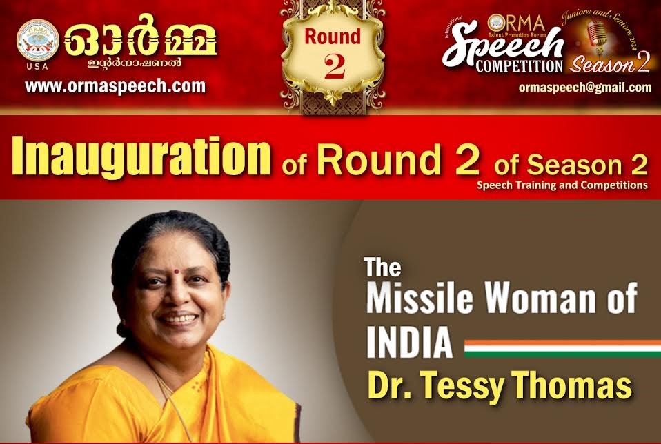 പാലാ/ഫിലഡൽഫിയ: ഓർമ്മാ ഇൻ്റർനാഷണൽ പ്രസംഗ മത്സര ധാര ലോകമലയാളികൾക്കെല്ലാം അഭിമാന തിലകമാണെന്ന് ഭാരത മിസ്സൈൽ വനിത ഡോ. ടെസ്സി തോമസ് പ്രസ്താവിച്ചു. മത്സരാർത്ഥികളുടെ എണ്ണം കൊണ്ടും, ക്രമീകരണ നൂതനതകൾകൊണ്ടും, അറിയപ്പെട്ടിടത്തോളം "സൂപ്പർ ഡ്യൂപ്പറായ" പ്രസംഗമത്സര പരിശീലനഘട്ടത്തിൻ്റെ, പ്രഭാങ്കുരം തെളിയ്ക്കുകയായിരുന്നു ടെസ്സി തോമസ്.