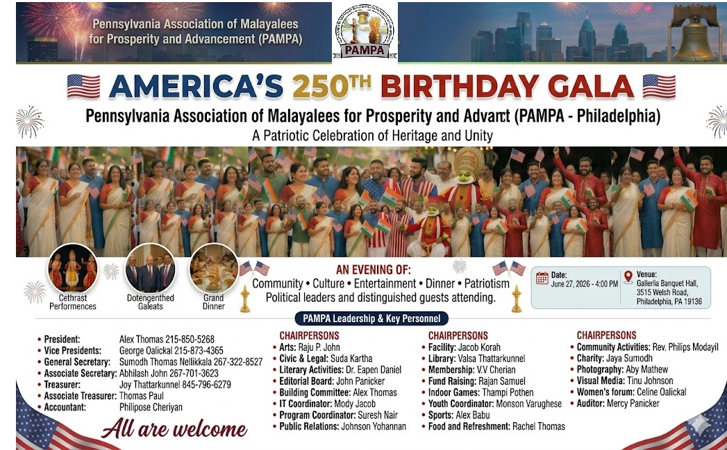ഫിലഡൽഫിയ: പെൻസിൽവാനിയ അസോസിയേഷൻ ഓഫ് മലയാളീസ് ഫോർ പ്രോസ്പെരിറ്റി ആൻഡ് അഡ്വാൻസ്മെന്റ് (PAMPA Philadelphia)യുടെ ആഭിമുഖ്യത്തിൽ അമേരിക്കയുടെ 250-ാം സ്വാതന്ത്ര്യദിനാഘോഷത്തോടനുബന്ധിച്ച് വിപുലമായ സാംസ്കാരിക പരിപാടി സംഘടിപ്പിക്കുന്നു.