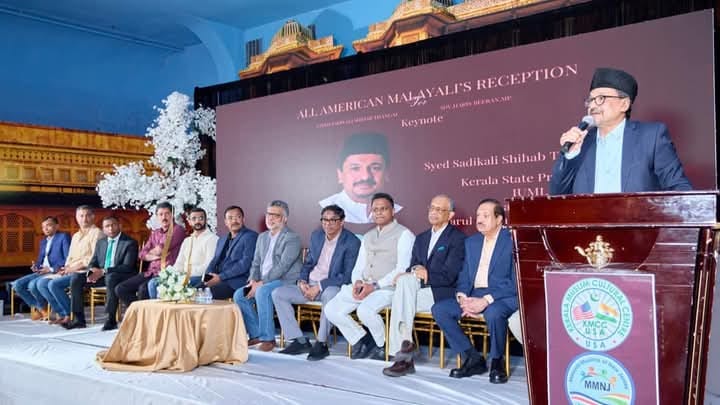 എഡിസണ് (ന്യൂജെഴ്സി): അമേരിക്കയില് സന്ദര്ശനം നടത്തുന്ന മുസ്ലിം ലീഗ് ദേശീയ പൊളിറ്റിക്കല് അഫയേഴ്സ് കമ്മിറ്റി ചെയര്മാന് പാണക്കാട് സയ്യിദ് സാദിഖലി ശിഹാബ് തങ്ങള്ക്കും രാജ്യ സഭാംഗവും സുപ്രീം കോടതി അഭിഭാഷകനുമായ ഹാരിസ് ബീരാനും അമേരിക്കന് പ്രവാസി സമൂഹം ഹൃദ്യമായ സ്വീകരണം നല്കി.കേരള മുസ്ലിം കള്ച്ചറല് സെന്റര് (കെ.എം.സി.സി.), മലയാളി മുസ്ലിംസ് ഓഫ് ന്യൂജെഴ്സി (എം.എം.എന്.ജെ), കേരള അസോസിയേഷന് ഓഫ് ന്യൂജെഴ്സി, നന്മ എന്നീ സംഘടനകള് ചേര്ന്ന് റോയല് ആല്ബര്ട്ട് പാലസില് സംഘടിപ്പിച്ച സംഗമത്തില് ഫൊക്കാന, ഫോമാ, ഇന്ത്യന് ഓവര്സീസ് കോണ്ഗ്രസ്, വേള്ഡ് മലയാളി കൗണ്സില്, കേരള അസ്സോസിയേഷന് ഓഫ് ന്യൂജെഴ്സി, കെ.എം.സി.സി തുടങ്ങി സമൂഹത്തിലെ എല്ലാ വിഭാഗത്തില് നിന്നുമുള്ള നേതാക്കളും പ്രവര്ത്തകരും പങ്കെടുത്തു. യു.എസ് കെ.എം.സി.സി പ്രസിഡന്റ് യു.എ നസീര് അദ്ധ്യക്ഷത വഹിച്ചു.