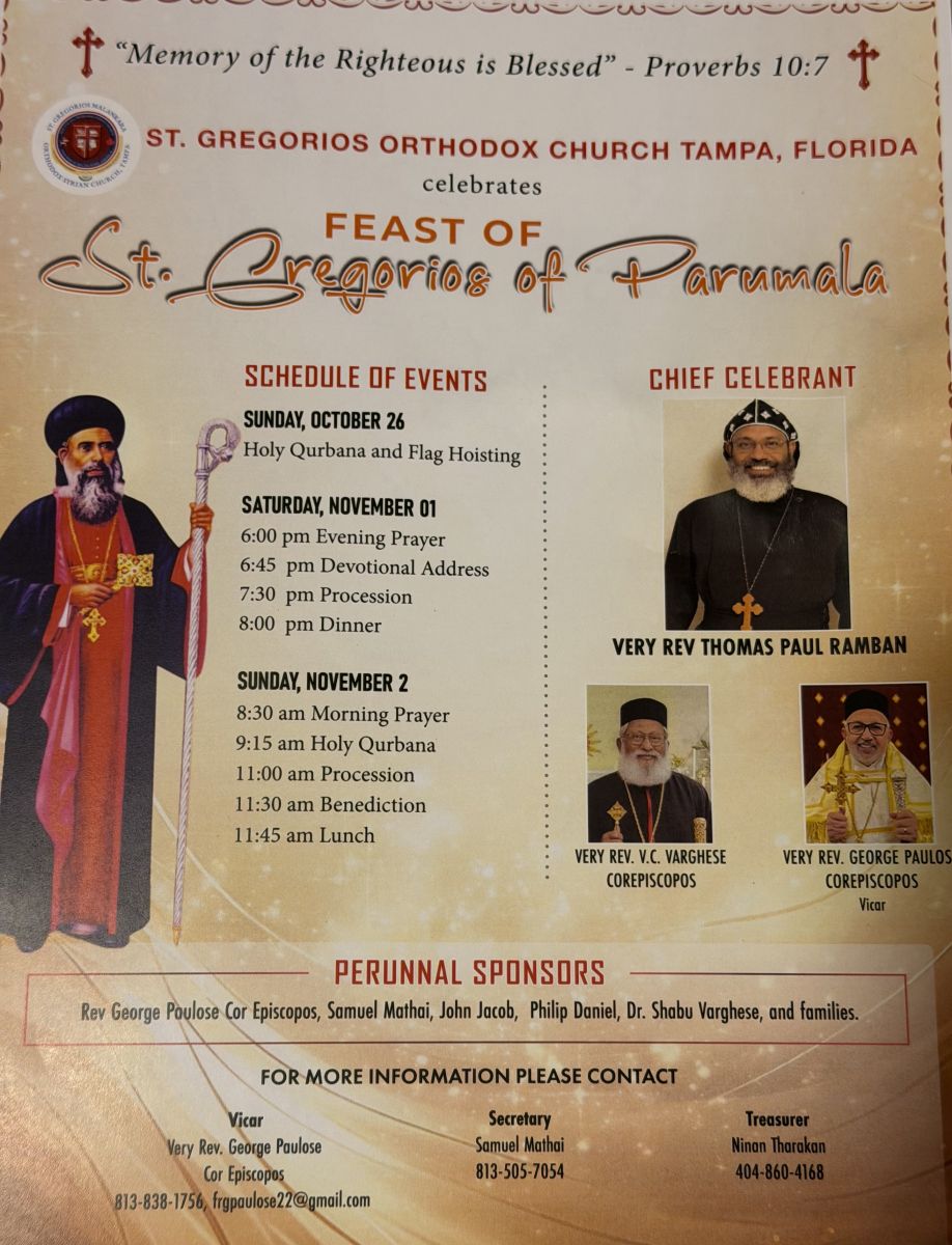 ടാമ്പാ: മലങ്കര ഓര്ത്തഡോക്സ് സഭയുടെ പ്രഥമ പരിശുദ്ധനായ പരുമല തിരുമേനിയുടെ 123-ാമത് ഓര്മ്മപ്പെരുന്നാള്, ടാമ്പാ സെന്റ് ഗ്രീഗോറിയോസ് ഓര്ത്തഡോക്സ് ദേവാലയത്തില് നവംബര് ഒന്ന്, രണ്ട് തീയതികളില് ഭക്തിസാന്ദ്രമായ അന്തരീക്ഷത്തില് നടത്തപ്പെടും.