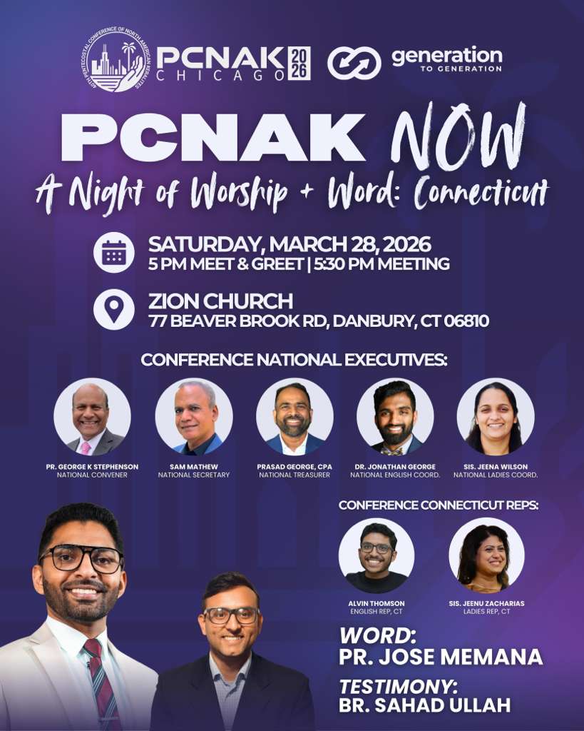 ചിക്കാഗോ: ജൂലൈ 2 മുതൽ 5 വരെ ചിക്കാഗോയിൽ നടക്കുന്ന നാൽപ്പതാമത് പിസിനാക്കിന്റെ ആഭിമുഖ്യത്തിലുള്ള പ്രീ കോൺഫറൻസ് മാർച്ച് 28 ശനിയാഴ്ച 5 മണിക്ക് കണക്ടിക്കട്ടിലുള്ള ഡാൻബറി സയോൺ ചർച്ചിൽ നടക്കും. പാസ്റ്റർ ജോസ് മേമന, സഹദ് ഉല്ല എന്നിവർ പ്രസംഗിക്കും. ആൽവിൻ തോംപ്സൺ ജീനാ സക്കറിയ എന്നിവർ നേതൃത്വം നൽകും