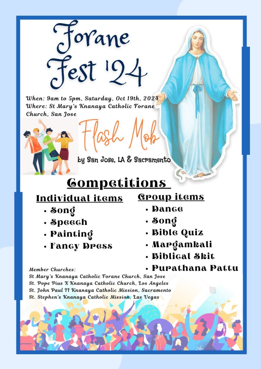 സാൻ ഹൊസെ , കാലിഫോർണിയ : അമേരിക്കയിലെ കാലിഫോർണിയ സംസ്ഥാനത്തുള്ള സാൻ ഹൊസെയിലെ സെന്റ് മേരീസ് ക്നാനായ കത്തോലിക്ക പള്ളിയിലേക്ക് ഫൊറോന ഫെസ്റ്റ് വരവായി . ഈ വരുന്ന ശനിയാഴ്ച ഒക്ടോബര് 19 ന് ആണ് ഈ മഹോത്സവം നടപ്പെടുന്നത് .
