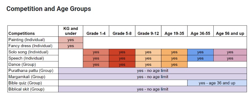 കിൻഡർ ഗാർഡൻ കുട്ടികൾക്കായി ചിത്രരചനയും , പിന്നെ ഫാൻസി ഡ്രസ്സ് മത്സരങ്ങളും ആണ് നടത്തപ്പെടുന്നത് . ഒന്നാം ക്ലാസ് മുതൽ 12 ആം ക്ലാസ് വരെ ഉള്ള കുട്ടികൾക്കും , 19 വയസ്സ് മുതൽ മുകളിലേക്കുള്ളവർക്കായി പാട്ട് , പ്രസംഗം എന്നീ വ്യക്തിഗത മത്സരങ്ങളും , ഗ്രൂപ്പ് ഡാൻസും ആണ് മത്സര ഇനങ്ങൾ . 36 വയസ് മുതൽ മുകളിൽ ഉള്ളവർക്കായി ഗ്രൂപ്പ് ഐറ്റം ആയ ബൈബിൾ ക്വിസ് നടത്തപ്പെടുന്നു.