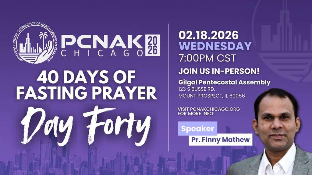 ചിക്കാഗോ: ജൂലൈ ആദ്യവാരം ചിക്കാഗോയിൽ നടക്കുന്ന നാല്പതാമത് പെന്തക്കോസ്തൽ കോൺഫ്രൻസ് ഓഫ് നോർത്ത് അമേരിക്കയുടെ അനുഗ്രഹത്തിന് വേണ്ടി ജനുവരി 10ന് ആരംഭിച്ച 40 ദിവസത്തെ ഉപവാസ പ്രാർത്ഥന ഫെബ്രുവരി 18 ബുധനാഴ്ച സമാപിക്കും. അമേരിക്കയുടെ വിവിധ സംസ്ഥാനങ്ങളിൽ നിന്നായി എഴുപതോളം പേരാണ് 40 ദിവസം നീണ്ടുനിന്ന ഉപവാസ പ്രാർത്ഥന ചങ്ങലയിൽ അണിചേർന്നത്. നാഷണൽ പ്രയർ കോർഡിനേറ്റർ പാസ്റ്റർ പി വി മാമൻ, ലോക്കൽ പ്രയർ കോർഡിനേറ്റേഴ്സ് ആയ പാസ്റ്റർ ബാബു മാത്യു കുമ്പഴ, പാസ്റ്റർ ആൻഡ്രൂസ് കെ ജോർജ്, ചാക്കോ തോമസ് എന്നിവർ നേതൃത്വം നൽകി. ഞായറാഴ്ച വൈകുന്നേരം ഓൺലൈൻ പ്ലാറ്റ്ഫോമിലും പ്രാർത്ഥനയുണ്ടായിരുന്നു. ഗിൽഗാൽ പെന്തക്കോസ്തൽ അസംബ്ലിയിൽ ബുധനാഴ്ച വൈകിട്ട് നടക്കുന്ന സമാപന സമ്മേളനത്തിൽ പാസ്റ്റർ ഫിന്നി മാത്യു മുഖ്യാതിഥിയായിരിക്കും. ലോക്കൽ കമ്മിറ്റി ഭാരവാഹികളായ പാസ്റ്റർ ജിജു പി ഉമ്മൻ ഡോ ടൈറ്റസ് ഈപ്പൻ, ഡോ ബിജു ചെറിയാൻ, ജോൺ മത്തായി, കെ ഓ ജോസ് സിപിഎ, വർഗീസ് സാമുവൽ എന്നിവർ നേതൃത്വം നൽകും.
