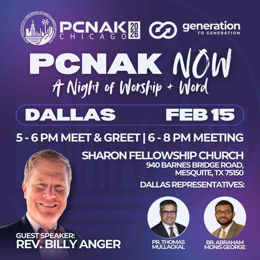 ചിക്കാഗോ: ജൂലൈ 2-5 വരെ ചിക്കാഗോയിൽ നടക്കുന്ന നാൽപ്പതാമത് പിസിനാക്കിന്റെ ആഭിമുഖ്യത്തിൽ ഫെബ്രുവരി 15 ഞായറാഴ്ച ഡാളസിൽ വച്ച് പ്രത്യേക സമ്മേളനം നടത്തുന്നു. ശാരോൻ ഫെല്ലോഷിപ്പ് ചർച്ചിൽ വൈകിട്ട് അഞ്ചുമണിക്ക് ആരംഭിക്കുന്ന സമ്മേളനത്തിൽ റവ ബില്ലി ആങ്കർ മുഖ്യ സന്ദേശം നൽകും. പിസിനാക്ക് ദേശീയ ഭാരവാഹികളായ കൺവീനർ പാസ്റ്റർ ജോർജ് കെ സ്റ്റീഫൻസൺ, സെക്രട്ടറി സാം മാത്യു, ട്രഷറർ പ്രസാദ് ജോർജ് സിപിഎ, ഡോ ജോനാഥൻ ജോർജ്, ജീന വിൽസൺ എന്നിവർ പങ്കെടുക്കും. ഡാല്ലസിൽ നിന്നുള്ള ദേശീയ കമ്മിറ്റി അംഗങ്ങളായ പാസ്റ്റർ തോമസ് മുല്ലക്കൽ, ഏബ്രഹാം മോനിസ് ജോർജ് എന്നിവർ യോഗത്തിന് നേതൃത്വം നൽകും. ഡാളസ് സിറ്റിയിലെ കൊയർ അംഗങ്ങൾ പ്രയ്സ് ആൻഡ് വർഷിപ്പിന് നേതൃത്വം നൽകും.