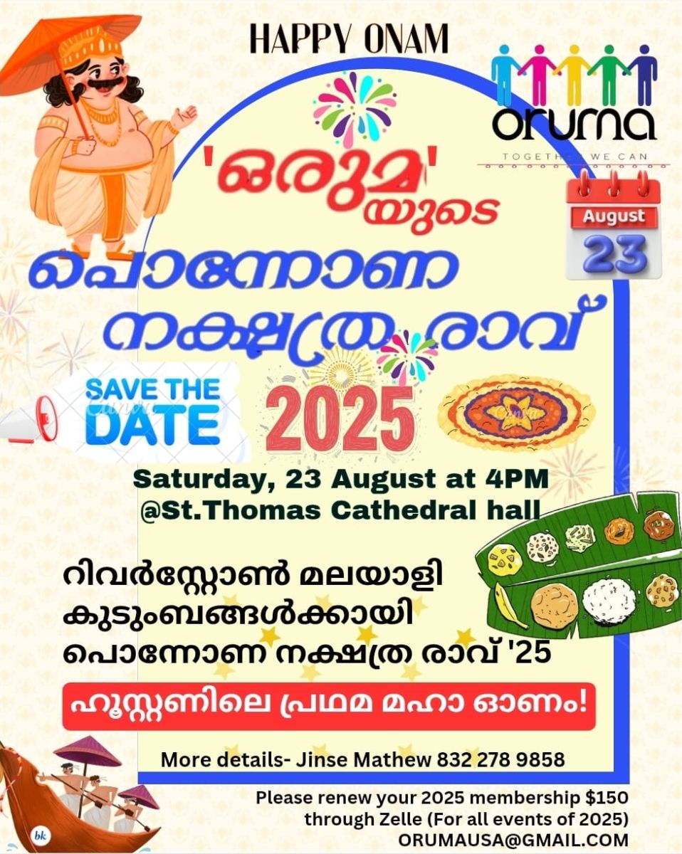 ഓഗസ്റ്റ് മാസം 23 ശനിയാഴ്ച്ച വൈകുന്നേരം നാല് മണി മുതൽ സെയിൻ്റ് തോമാസ് ആഡിറ്റോറിയത്തിൽ ചേരുന്ന ഒരുമയുടെ “പൊന്നോണ നക്ഷത്ര രാവിൽ” വിത്യസ്തങ്ങളായ ദേശീയ,അന്തർദേശീയ കലാ പരിപാടികൾ അരങ്ങേറുന്നു.