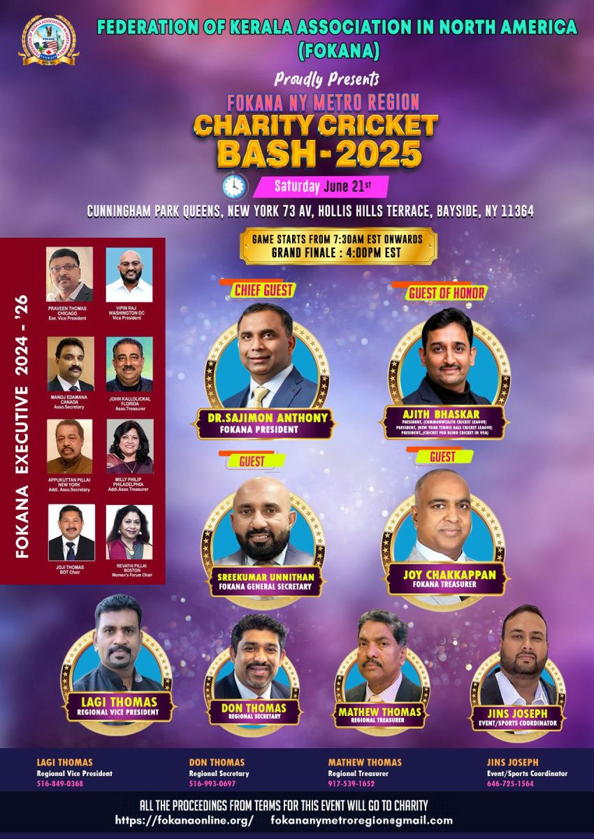 ന്യൂ യോർക്ക്: ഫൊക്കാന ന്യൂയോർക്ക് മെട്രോ റീജിയന്റെ നേതൃത്വത്തിൽ ജൂൺ 21,ശനിയാഴ്ച നടക്കുന്ന ചാരിറ്റി ക്രിക്കറ്റ് ബാഷ് ടൂർണമെന്റിനുള്ള ഒരുക്കങ്ങൾ പൂർത്തിയായതായി ഫൊക്കാന ന്യൂയോർക്ക് മെട്രോ റീജണൽ വൈസ് പ്രസിഡന്റ് ലാജി തോമസ് അറിയിച്ചു.