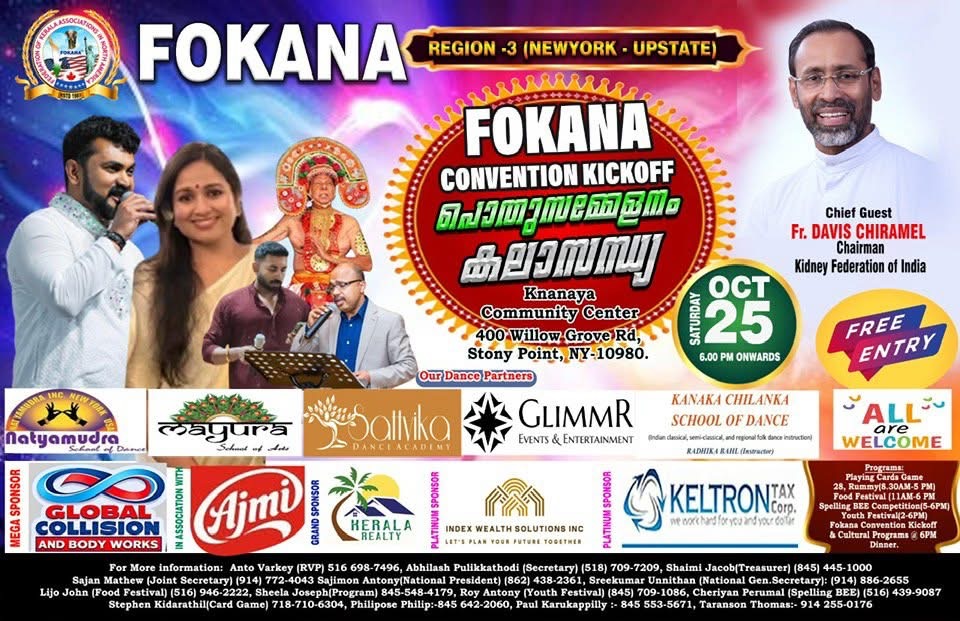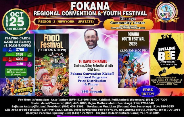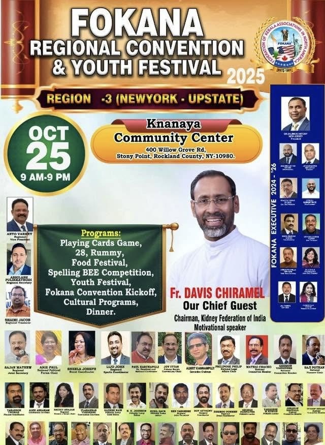 ന്യൂ യോർക്ക് : ഫൊക്കാന ന്യൂ യോർക്ക് അപ്പ്സ്റ്റേറ്റ് റീജിയണൽ കൺവെൻഷന്റെ ഒരുക്കങ്ങൾ പൂർത്തിയായി. ഫുഡ് ഫെസ്റ്റിവൽ, യൂത്ത് ഫെസ്റ്റിവൽ, സ്പെല്ലിങ് ബീ കോംപറ്റീഷൻ, ചിട്ടുകളി മത്സരം, ഫൊക്കാന കലഹരി ഇന്റർനാഷണൽ കൺവെൻഷൻ കിക്ക് ഓഫ് തുടങ്ങിയ നിരവധി പരിപാടികളോട് ആണ് റീജണൽ കൺവെൻഷൻ ചിട്ടപ്പെടുത്തിയിട്ടുള്ളത് . ഈ ശനിയാഴ്ച 2025 ഒക്ടോബർ 25, റോക്കലാൻഡ് കൗണ്ടിയിലെ ക്നാനായ കമ്മ്യൂണിറ്റി സെന്ററിൽ വെച്ച് (400 Willow Grove Road, Stony Point , Rockland County) നടത്തുന്ന റീജണൽ കൺവെൻഷനിലേക്കു ഏവരെയും സ്വാഗതം ചെയ്യുന്നു.