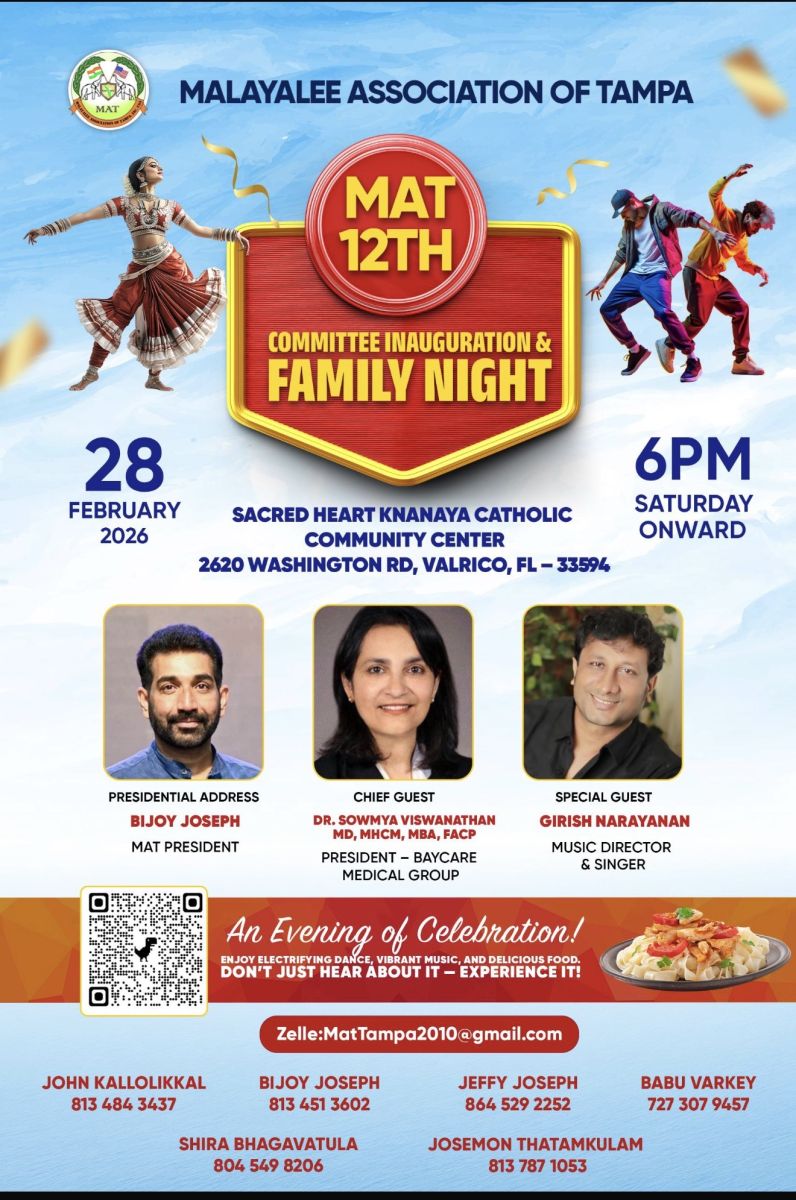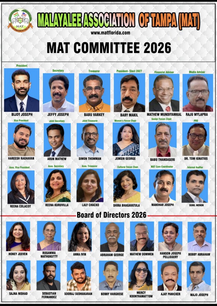 ടാമ്പാ: മലയാളി അസോസിയേഷന് ഓഫ് ടാമ്പായുടെ (MAT)പന്ത്രണ്ടാമത് കമ്മിറ്റിയുടെ പ്രവര്ത്തനോദ്ഘാടനവും കുടുംബ സംഗമവും സംയുക്തമായി ആഘോഷിക്കുന്നതിനുള്ള ഒരുക്കങ്ങള് പൂര്ത്തിയായതായി ഭാരവാഹികള് അറിയിച്ചു.