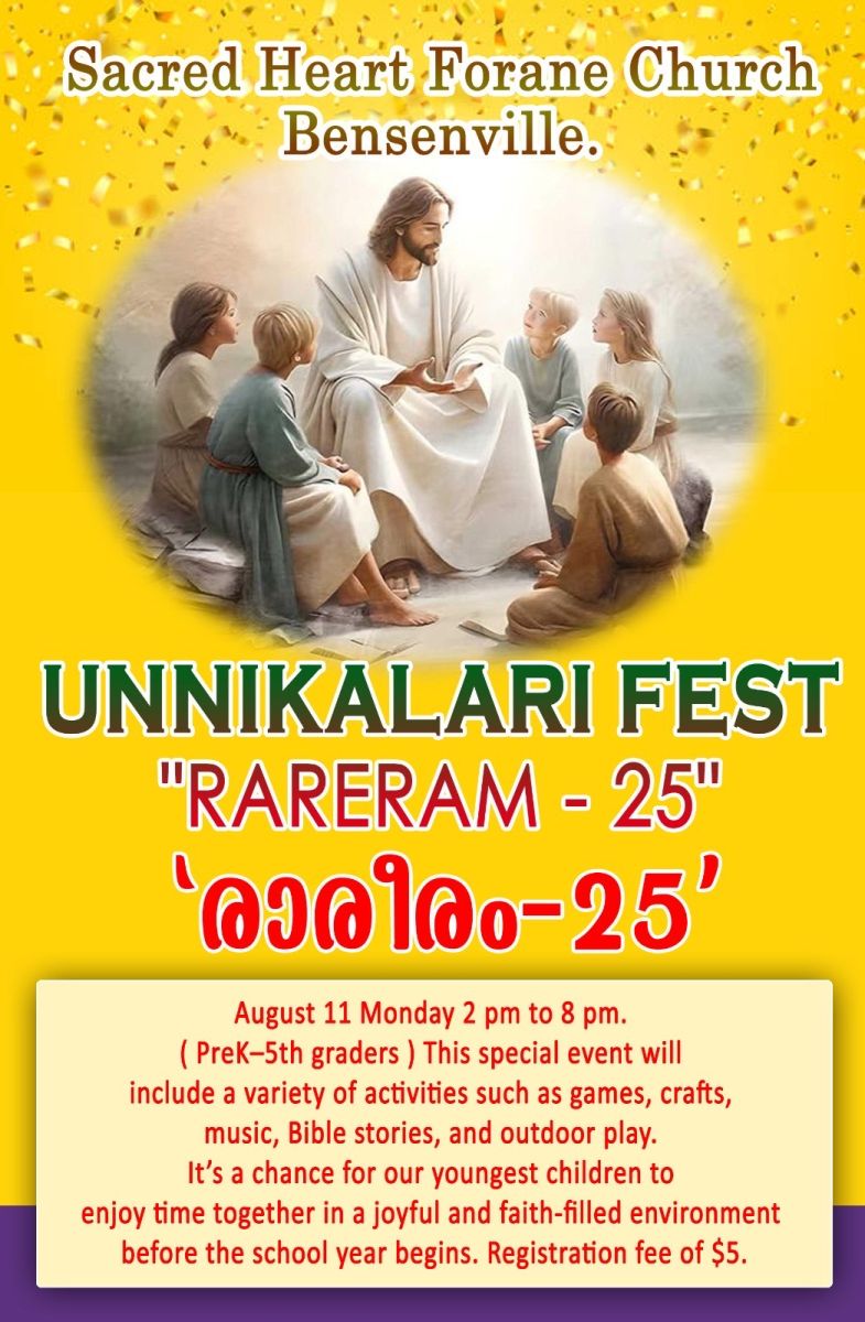 " രാരീരം 25" ബെൻസൻവില്ലിൽ . ചിക്കാഗോ: ബെൻസൻവിൽ തിരുഹൃദയ ക്നാനായ കത്തോലിക്കാ ഫൊറോന ദൈവാലയത്തിൽ കുട്ടികൾക്കായ് " രാരീരം 25 " കൂട്ടായ്മ ഇടവകയിലെ യുവജനങ്ങളുടെ നേതൃത്വത്തിൽ സംഘടിപ്പിക്കുന്നു. ഒന്നാം ക്ലാസു മുതൽ അഞ്ചാം ക്ലാസു വരെയുള്ള കുട്ടികളെ ഉൾപെടുത്തിക്കൊണ്ട് ആഗസ്റ്റ് 11 തിങ്കളാഴ്ച ഉച്ചകഴിഞ്ഞ് 2 മുതൽ വൈകിട്ട് 8 വരെയാണ് പരിപാടി സംഘടിപ്പിക്കുന്നത്. കഴിഞ്ഞ രണ്ടു മാസക്കാലമായി എല്ലാ ഞായറാഴ്ചകളിലും ദൈവലയത്തിൽ സംഘടിപ്പിച്ചുപോന്ന "ഉണ്ണിക്കളരി " " ഗുരുകുലം " പാഠ്യപദ്ധതിയുടെ ഭാഗമായിട്ടാണ് യുവജനങ്ങൾ ഇത് സംഘടിപ്പിക്കുന്നത്. ബൈബിൾ വിജ്ഞാന ക്ലാസുകൾ , വിവിധ കളികൾ, പാട്ടുകൾ, ചിത്രരചനകൾ തുടങ്ങിയ ഇവയിൽ ഉൾപ്പെടുത്തിയിട്ടുണ്ട്. ഹന്നാ ചേലയ്ക്കൽ, എലെയ്ൻ ഒറ്റത്തയ്ക്കൽ, സാറ മുളയാനിക്കുന്നേൽ, സെറീന മുളയാനിക്കുന്നേൽ, അൽഫോൻസ പുള്ളോർക്കുന്നേൽ എന്നിവർ " രാരീരം 25 " ന്നേതൃത്വം നൽകും