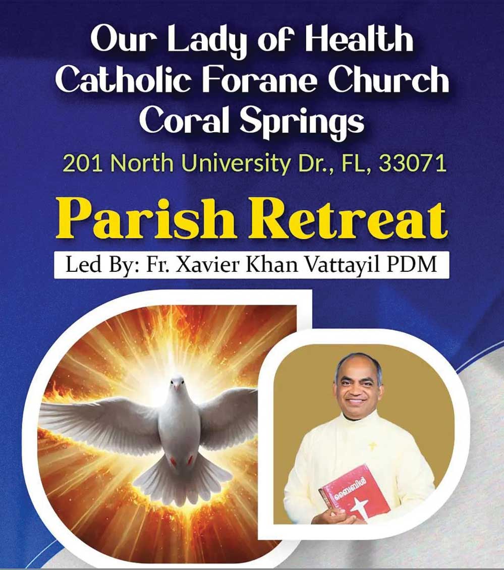 മയാമി: മയാമി ഔവര് ലേഡി ഓഫ് ഹെല്ത്ത് കാത്തലിക് ഫോറോനാ ദേവാലയത്തില് പ്രസിദ്ധ ധ്യാനഗുരു റവ. ഫാ. സേവ്യര് ഖാന് വട്ടായില് ജഉങ നയിക്കുന്ന ഇടവകധ്യാനം ജൂലൈ 24-ാം തീയതി വ്യാഴാഴ്ച വൈകുന്നേരം ആരംഭിക്കും.