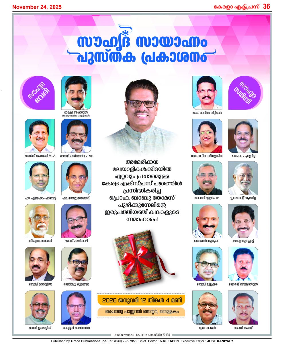 കഴിഞ്ഞ ഇരുപത്തിയഞ്ചു വര്ഷമായി അമേരിക്കയിലെ കേരളാ എക്സ്പ്രസ് പത്രത്തിന്റെ കണ്സള്ട്ടന്റ് എഡിറ്റര് എന്ന നിലയിലും മറ്റു സര്ഗാത്മക സംഭാവനകളുടെയും അംഗീകാരമായി പ്രൊഫ. ബാബു പൂഴിക്കുന്നേലിന് 'അക്ഷരശ്രേഷ്ഠ' പുരസ്കാരം സമര്പ്പിക്കും.