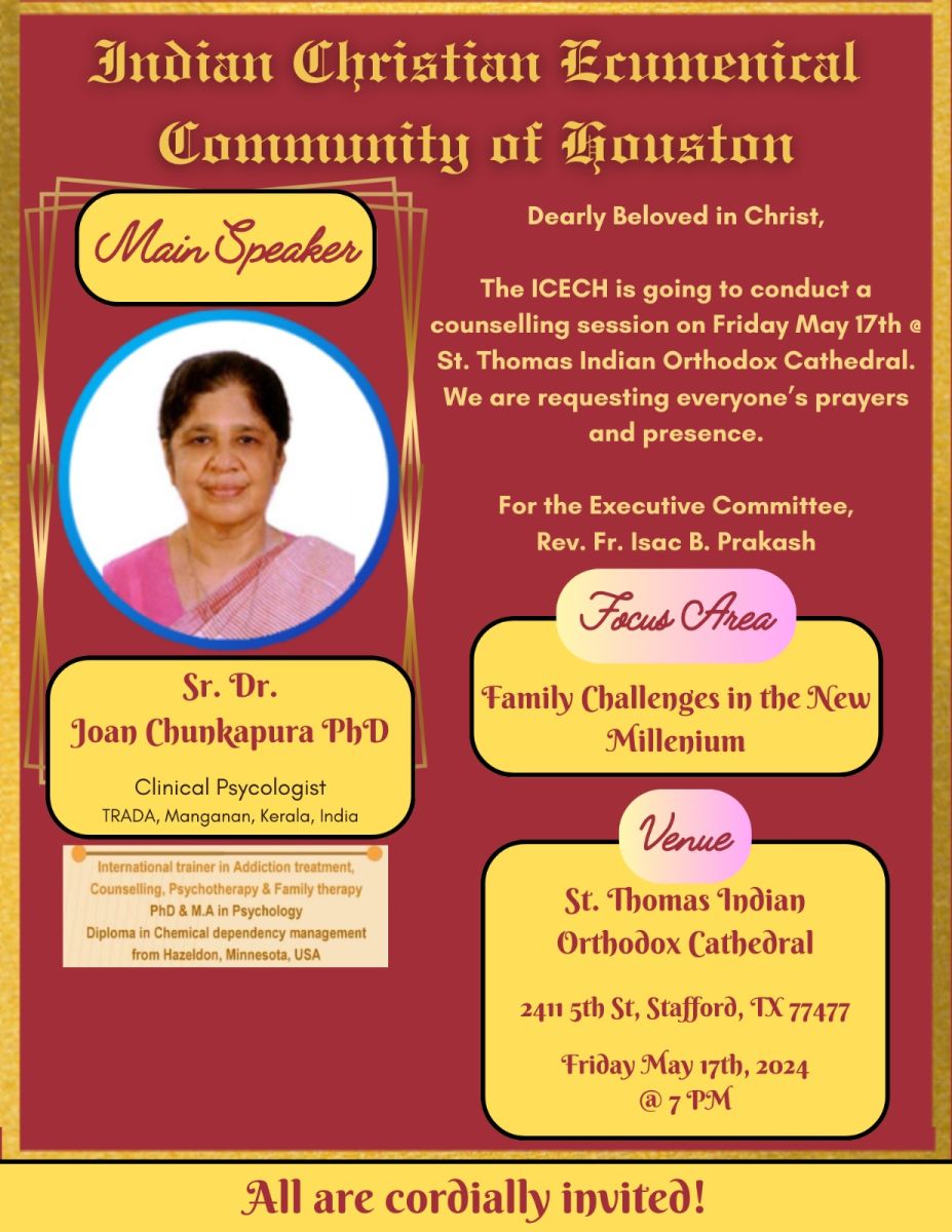 മെയ് 17 നു വെള്ളിയാഴ്ച വൈകുന്നേരം 7 മണിക്ക് ഇന്ത്യൻ ക്രിസ്ത്യൻ എക്യൂമെനിക്കൽ കമ്മ്യൂണിറ്റി ഓഫ് ഹൂസ്റ്റൺ (ഐസിഇസിഎച്ച്) ന്റെ ആഭിമുഖ്യത്തിൽ സെന്റ് തോമസ് ഓർത്തഡോൿസ് കത്തീഡ്രലിൽ വച്ച് നടക്കുന്ന മീറ്റിംഗിൽ "Family Challenges in the New Millennium" എന്നുള്ള വിഷയത്തെ സംബന്ധിച്ച് സിസ്റ്റർ ക്ലാസ് എടുക്കും.