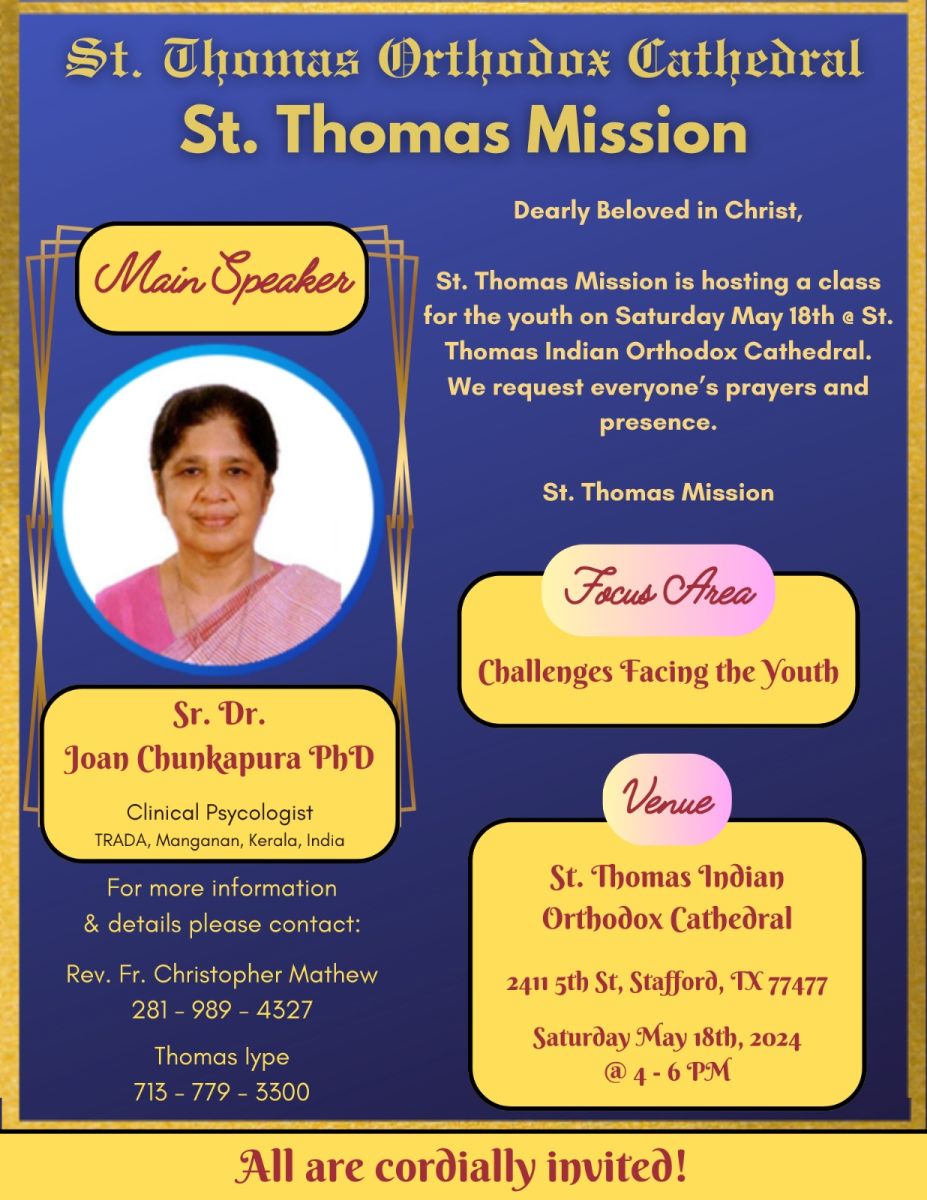 മെയ് 18 നു ശനിയാഴ്ച വൈകുന്നേരം 4- 6 വരെ സെന്റ് തോമസ് ഓർത്തഡോൿസ് കത്തീഡ്രൽ ചർച്ച് സെന്റ് തോമസ് മിഷൻന്റെ ആഭിമുഖ്യത്തിൽ ഹൂസ്റ്റണിലുള്ള എല്ലാ യുവജനങ്ങൾക്ക് വേണ്ടി "Challenges Facing the Youth" എന്നുള്ള വിഷയത്തെ സംബന്ധിച്ച് ക്ലാസ്സിന് സിസ്റ്റർ നേതൃത്വം നൽകും.