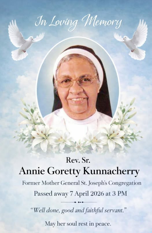 കോട്ടയം : സെൻ്റ്. ജോസഫ്സ് കോൺഗ്രിഗേഷൻ്റെ മുൻ മദർ ജനറാൾ സിസ്റ്റർ ആൻ ഗൊരേത്തി കുന്നശ്ശേരി ( 89 ) അന്തരിച്ചു. ദിവംഗതനായ മാർ കുര്യാക്കോസ് കുന്നശ്ശേരി പിതാവിൻ്റെ സഹോദരിയാണ് സിസ്റ്റർ . മറ്റ് സഹോദരങ്ങൾ: ഡോ. ജോസഫിൻ കുന്നശ്ശേരി , സാവിയോ കുന്നശ്ശേരി , ആൻസി സണ്ണി വെട്ടത്തു കണ്ടത്തിൽ , പരേതരായ തങ്കമ്മ കമ്പക്കാലുങ്കൽ , കെ. ജെ .ജോൺ കുന്നശ്ശേരി , സിസ്റ്റർ പയസ് SJ C