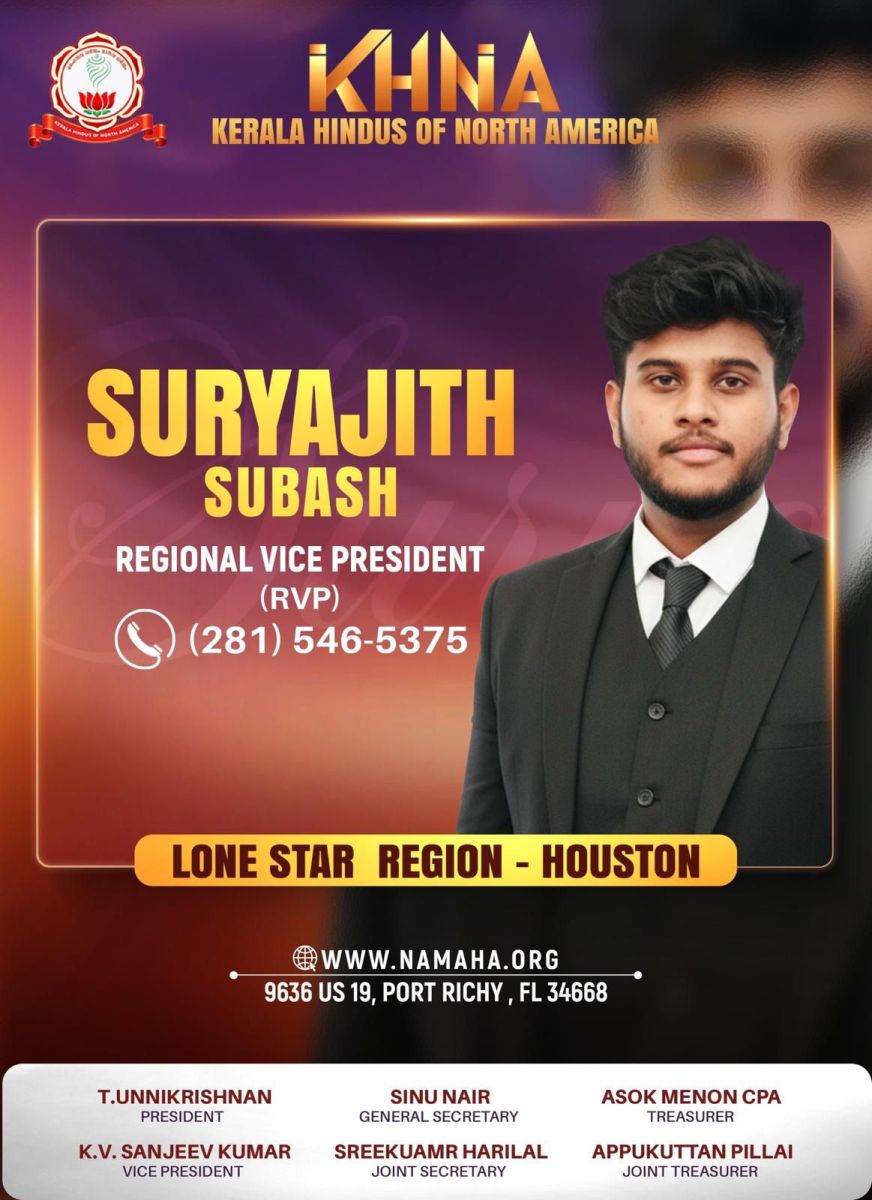 ഹ്യൂസ്റ്റൺ: കേരള ഹിന്ദൂസ് ഓഫ് നോർത്ത് അമേരിക്ക (KHNA) യുടെ ലോൺ സ്റ്റാർ - ഹ്യൂസ്റ്റൺ റീജിയണൽ വൈസ് പ്രസിഡന്റായി (RVP) തിരുവനന്തപുരം സ്വദേശിയായ സൂര്യജിത്ത് സുഭാഷ് സ്ഥാനമേറ്റു. നിലവിൽ ടെക്സസിലെ ഹ്യൂസ്റ്റണിൽ താമസിക്കുന്ന അദ്ദേഹം ഒരു ഇക്വിറ്റി ട്രേഡർ കൂടിയാണ്.