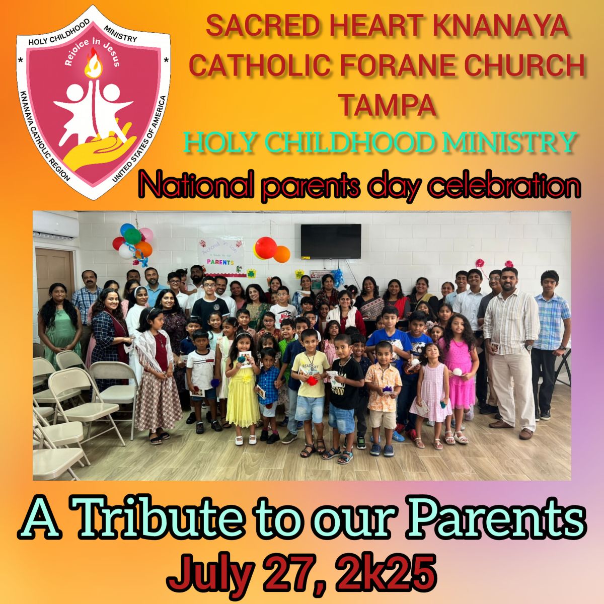 താമ്പാ: സേക്രഡ് ഹാർട്ട് ക്നാനായ കത്തോലിക്കാ ഫൊറോനാ പള്ളിയിൽ ദേശീയ പേരന്റ്സ് ദിനം ആഘോഷിച്ചു. ഹോളി ചൈൽഡ്ഹുഡ് മിനിസ്ട്രിയുടെ ആഭിമുഖ്യത്തിൽ നടത്തിയ ആഘോഷങ്ങൾക്ക് കുട്ടികൾ തന്നെ നേതൃത്വം നൽകിയതും വിവിധ പരിപാടികൾ അവതരിപ്പിച്ചതും മാതാപിതാക്കളുടെ മനം കവരുന്നതായിരുന്നു.