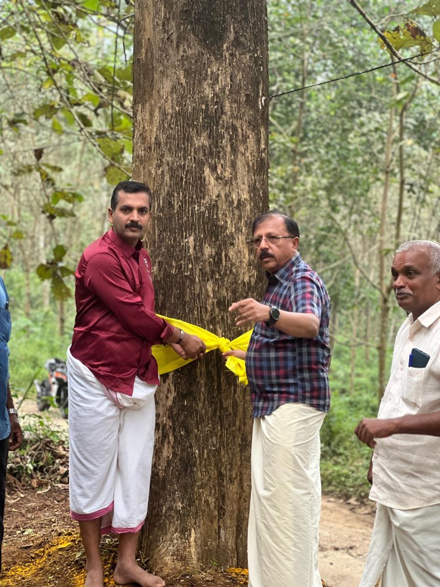 തേക്ക് മരം വെട്ടുന്നതിനുമുമ്പ് ആവശ്യമായ അനുമതിയും അനുഗ്രഹവും തേടി 28-11-2025ന് നടത്തിയ ചടങ്ങിന്റെ ദൃശ്യങ്ങളാണ് ചിത്രത്തിൽ .