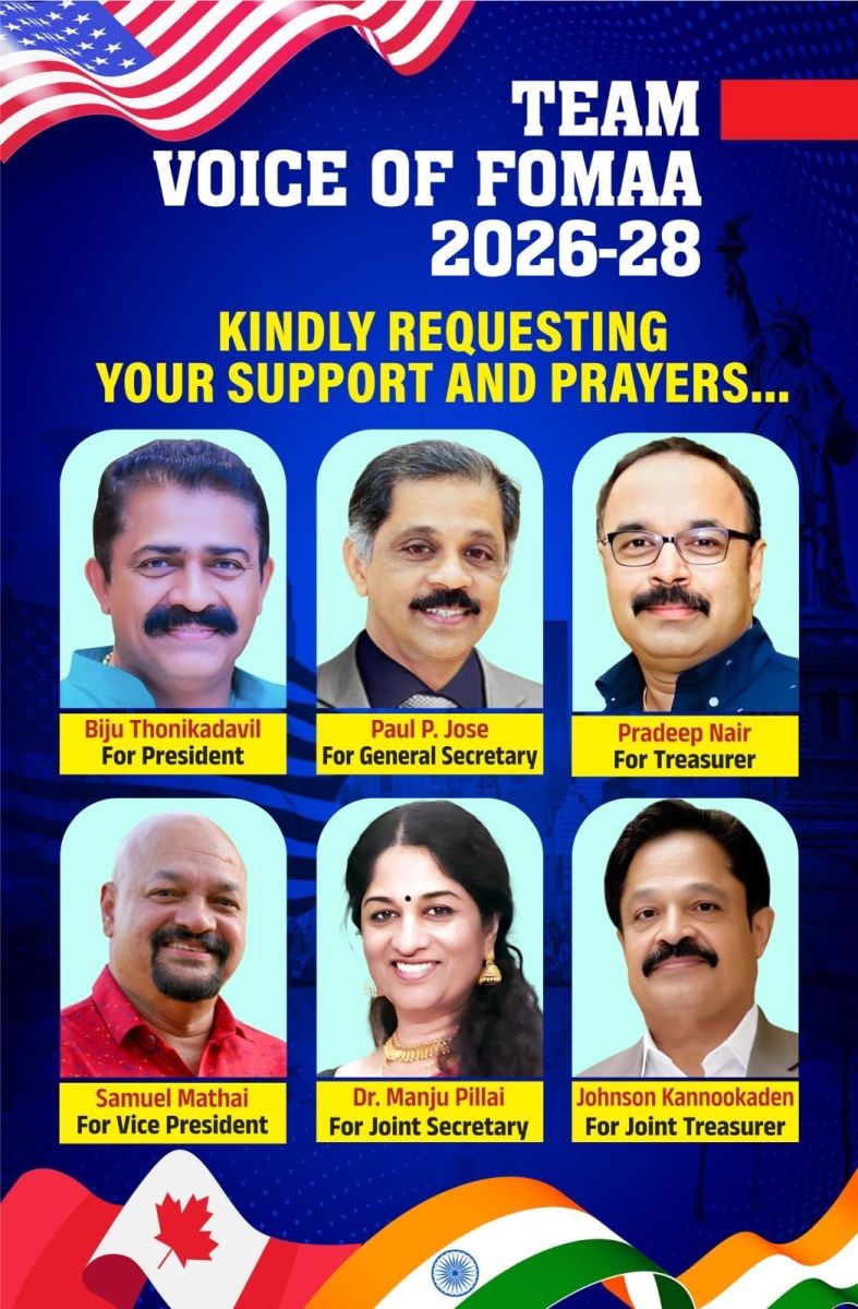 2026-28 കാലയളവിലേക്കുള്ള ഫോമായെ നയിക്കുവാൻ ടീം ‘വോയിസ് ഓഫ് ഫോമാ’ സർവ്വസജ്ജമായി മുന്നേറുന്നു. പ്രവർത്തനപാരമ്പര്യവും ജനപ്രീതിയും ഏറെയുള്ള ആറു സ്ഥാനാർത്ഥികൾ ഒറ്റക്കെട്ടായി പ്രസിഡണ്ട് സ്ഥാനത്തേക്ക് മത്സരിക്കുന്ന ബിജു തോണിക്കടവിലിനോടൊപ്പം അണി ചേരുകയാണ്. ബിജു തോണിക്കടവിലിനോടൊപ്പം ജനറൽ സെക്രട്ടറിയായി ന്യൂയോർക്കിൽ നിന്നുള്ള പോൾ പി ജോസും, ട്രഷററായി കണക്ടിക്കട്ടിൽ നിന്നുള്ള പ്രദീപ് നായരും, വൈസ് പ്രസിഡൻ്റായി ടെക്സാസിൽ നിന്നുള്ള സാമുവൽ മത്തായിയും, ജോയൻ്റ് സെക്രട്ടറിയായി അരിസോണയിൽ നിന്നുള്ള ഡോക്ടർ മഞ്ജു പിള്ളയും, ജോയൻ്റ് ട്രഷററായി ഷിക്കാഗോയിൽ നിന്നുള്ള ജോൺസൺ കണ്ണൂക്കാടനുമാണ് മത്സരിക്കുന്നത്. നോർത്ത് അമേരിക്കയിലും കാനഡയിലും ഉള്ള ഒട്ടു മിക്ക അസോസിയേഷനുകളും ടീം ‘വോയിസ് ഓഫ് ഫോമയ്ക്ക്’ പിന്തുണ പ്രഖ്യാപിച്ചിട്ടുണ്ട് എന്നുള്ളത് പ്രത്യേകം എടുത്തു പറയട്ടെ. മറ്റ് പലരും മത്സര രംഗത്ത് ഉണ്ടെന്ന് അറിയിച്ചിട്ടുണ്ടെങ്കിലും ഈ ടീമിന് ബദലായി ഒരു ടീം ഇതുവരെ നിലവിൽ വന്നിട്ടില്ല എന്നുള്ളതും വളരെ ശ്രദ്ധേയമാണ്. 2028 ലെ ഫോമാ കൺവെൻഷന്റെ ഒരു വ്യക്തമായ പ്ലാൻ ഇപ്പോഴേ ഈ ടീമിന് ഉണ്ട് എന്ന് പ്രസിഡണ്ട് ബിജു തോണിക്കടവിൽ പറഞ്ഞു. ഫ്ലോറിഡയിൽ വെച്ചാണ് കൺവെൻഷൻ നടത്താൻ ആഗ്രഹമെങ്കിലും നാഷണൽ കമ്മറ്റിയുടെ അഭിപ്രായമനുസരിച്ച് ക്രൂയിസ് കൺവെൻഷനായോ,ഡെസ്റ്റിനേഷൻ കൺവെൻഷൻ ആയിട്ടോ അതുമല്ലെങ്കിൽ മറ്റു മേജർ സിറ്റികളിലൊ ആയിരിക്കും 2028ലെ കൺവെൻഷൻ നടത്തുക. അതുകൂടാതെ തന്നെ ഫോമായെ അടുത്ത ലെവലിൽ എത്തിക്കുവാനുള്ള വിവിധ പദ്ധതികളും പ്ലാനുകളും ആസൂത്രണം ചെയ്തു കൊണ്ടിരിക്കുകയാണ്. ഏറെ വൈകാതെ തന്നെ ടീം വിഭാവനം ചെയ്യുന്ന പ്രവർത്തനങ്ങളുടെ ഒരു പ്രവർത്തന രൂപരേഖ പ്രവർത്തകർക്ക് മുന്നിൽ സമർപ്പിക്കുവാൻ സാധിക്കും എന്ന് അറിയിച്ചു. നോർത്ത് അമേരിക്കയിലും കാനഡയിലുമുള്ള മലയാളികളുടെ ഉന്നമനത്തിനും, വളർച്ചക്കും സഹായകമായി ആയി നിലകൊള്ളുമെന്നും, രാജ്യത്തിൻ്റെ വിവിധ ഭാഗങ്ങളിൽ പൊളിറ്റിക്കൽ രംഗത്തും, സാമൂഹിക സാംസ്കാരിക രംഗങ്ങളിലും, സേവന രംഗത്തും തനതായ വ്യക്തിമുദ്ര പതിപ്പിച്ച് പ്രവർത്തിച്ചുകൊണ്ടിരിക്കുന്ന എല്ലാ മലയാളികളെയും ഏകോപിപ്പിച്ചുകൊണ്ട് നമ്മുടെ സമൂഹത്തെ അമേരിക്കയുടെ മുഖ്യധാരയിൽ എത്തിക്കുവാൻ ആയിരിക്കും ഈ കമ്മിറ്റി പ്രാധാന്യം നൽകുക അതുവഴി അമേരിക്കയുടെ വിവിധ മേഖലകളിൽ നമ്മുടെ സമൂഹത്തിന് ഭാവിയിൽ തങ്ങളുടെതായ വ്യക്തിമുദ്ര പതിപ്പിക്കുവാനും ഉയർച്ചയിലേക്ക് വളരുവാനും സാധിക്കും. വിശാലമായ ഈ കാഴ്ചപ്പാടുകളോടുകൂടി മത്സര രംഗത്ത് വന്നിരിക്കുന്ന ഞങ്ങളുടെ ടീമിന് എല്ലാവിധ പിന്തുണയും സഹായസഹകരണങ്ങളും നൽകി വിജയിപ്പിക്കണമെന്ന് ഫോമായെ സ്നേഹിക്കുന്ന എല്