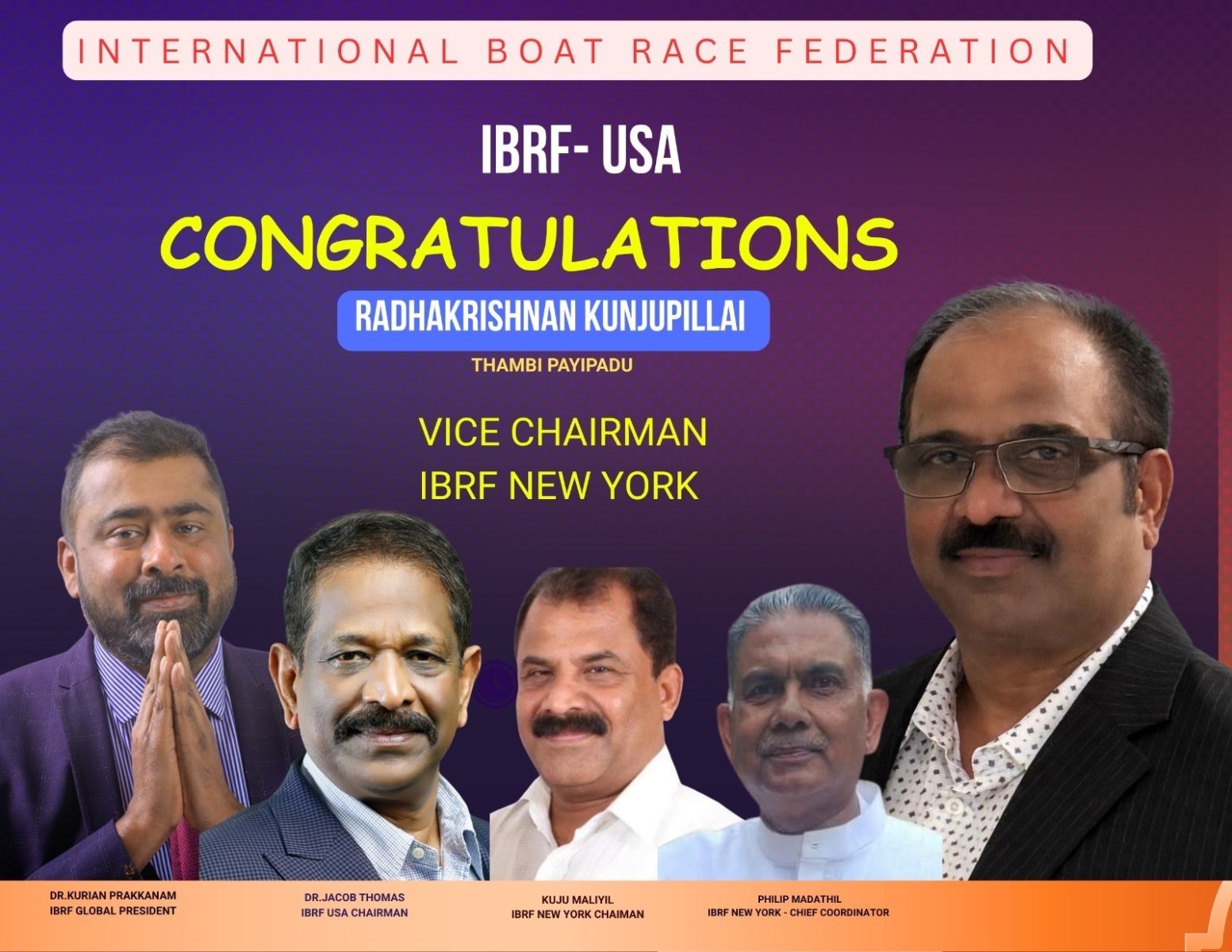 വള്ളംകളി മേഖലയിലെ ആഗോള കൂട്ടായ്മയായ( International Boat Race Federation ) ഐ ബി ആർ എഫിന്റെ പ്രവർത്തനങ്ങൾ നോർത്ത് അമേരിക്കയിൽ ശക്തമാക്കുന്നതിന്റെ ഭാഗമായി IBRF USA യിൽ പ്രവർത്തനങ്ങൾ ശ്കതമാക്കി. അമേരിക്കയുടെ വിവിധ സംസ്ഥാനങ്ങളിൽ IBRF ഗ്ലോബൽ കമ്മറ്റിയുടെ നിർദ്ദേശത്തിൽ കൂടുതൽ ചാപ്റ്ററുകൾ ഉടൻ നിലവിൽ വരുമെന്ന് IBRF യു എസ് എ ചെയർമാൻ ഡോ ജേക്കബ് തോമസ് അറിയിച്ചു. അമേരിക്കയിലെ വള്ളംകളി മേഖലയെ ആവേശകടലാക്കുന്ന തുഴക്കാരിൽ പ്രമുഖ സ്ഥാനിയായ തമ്പി പായിപ്പാട് എന്ന രാധാകൃഷ്ണൻ കുഞ്ഞുപിള്ളയെ അന്ത്രരാഷ്ട്ര വള്ളംകളി മേഖലയെ കൂട്ടിയിണക്കുന്ന പ്രസ്ഥാനമായ ഇന്റർനാഷണൽ ബോട്ട് റേസ് ഫെഡറേഷൻ ന്യൂയോർക്ക് സ്റ്റേറ്റ് വൈസ് ചെയർമാൻ ആയി golbal പ്രസിഡണ്ട് ശ്രീ കുര്യൻ പ്രക്കാനം നിയമിച്ചതായി IBRF USA ചെയർമാൻ ഡോ ജേക്കബ് തോമസ് അറിയിച്ചു .