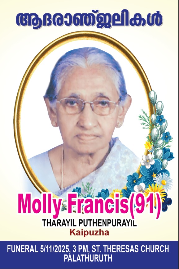 കൈപ്പുഴ: തറയിൽപുത്തൻപുരയിൽ മോളി ഫ്രാൻസിസ് (91) അന്തരിച്ചു. സംസ്കാരം ബുധൻ 3ന് പാലത്തുരുത്ത് സെന്റ് തെരേസാസ് ക്നാനായ കത്തോലിക്കാ പള്ളിയിൽ പേരൂർ വെള്ളാപ്പള്ളി കുടുംബാംഗമാണ്.ഭർത്താവ്: പരേതനായ ഫ്രാൻസിസ്. മക്കൾ: ഗീത,നീന, ബിജു, പരേതനായ ബോബി.
