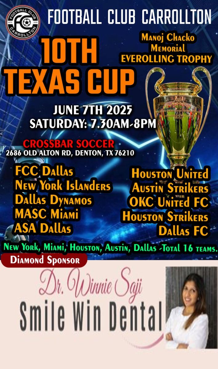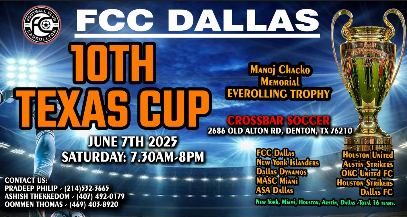 ഡാളസ്: ഡാളസിലെ മലയാളി സോക്കർ ക്ലബായ ഫുട്ബോൾ ക്ലബ് ഓഫ് കരോൾട്ടൺ (എഫ്സിസി ഡാളസ്) സംഘടിപ്പിക്കുന്ന പത്താമത് ടെക്സാസ് കപ്പ് (മനോജ് ചാക്കോ മെമ്മോറിയൽ എവർ റോളിംഗ് ട്രോഫി) സോക്കർ ടൂർണമെന്റ് ജൂൺ 7 ശനിയാഴ്ച നടക്കും.