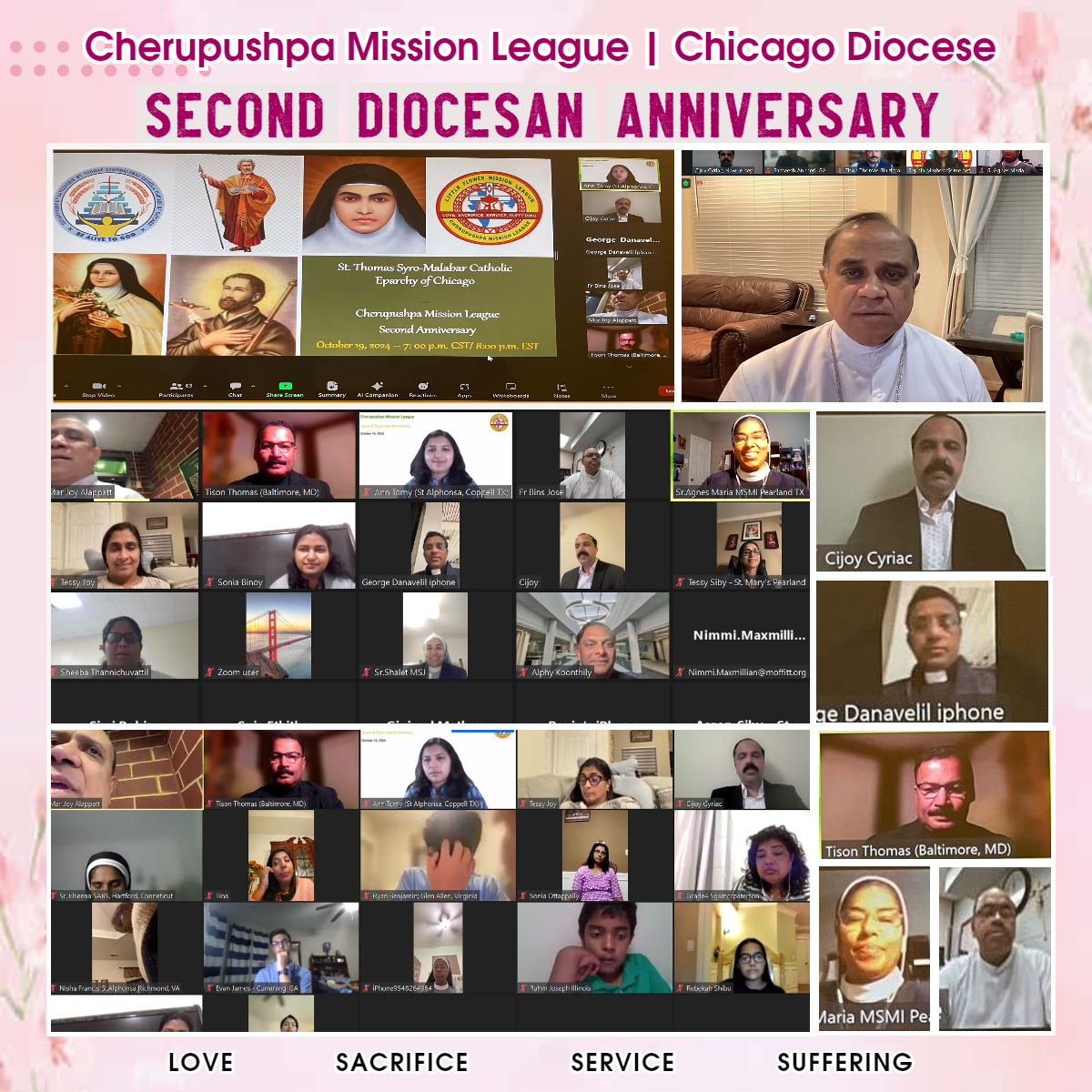 ചെറുപുഷ്പ മിഷന് ലീഗ് ചിക്കാഗോ രൂപത പ്രസിഡന്റ് സിജോയ് സിറിയക് പറപ്പള്ളിൽ യോഗത്തിൽ അധ്യക്ഷത വഹിച്ചു. മിഷന് ലീഗ് രൂപതാ ഡയറക്ടർ റവ.ഡോ. ജോർജ് ദാനവേലിൽ, ജനറൽ സെക്രട്ടറി ടിസൺ തോമസ്, എക്സിക്യൂട്ടീവ് അംഗങ്ങളായ ആൻ ടോമി, സോണിയാ ബിനോയ് എന്നിവർ പ്രസംഗിച്ചു. രൂപതാ അസിസ്റ്റൻറ് ഡയറക്ടർ ഫാ. ബിൻസ് ചേത്തലിൽ സ്വാഗതവും ജോയിന്റ് ഡയറക്ടർ സിസ്റ്റർ ആഗ്നസ് മരിയ എം.എസ്.എം.ഐ നന്ദിയും പറഞ്ഞു.