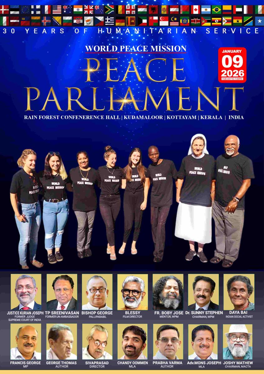 കോട്ടയം: വേൾഡ് പീസ് മിഷന്റെ നേതൃത്വത്തിൽ ലോകത്തിൽ ആദ്യമായി പീസ് പാർലമെന്റ് ജനുവരി 9 തീയതി കുടമാളൂർ റെയിൻ ഫോറസ്റ്റ് കോൺഫറൻസ് ഹാളിൽ വച്ച് നടത്തുന്നു. സുപ്രീം കോടതി മുൻ ജസ്റ്റിസ് കുര്യൻ ജോസഫ് പീസ് പാർലമെന്റ് ഉദ്ഘാടനം ചെയ്യും പ്രസ്തുത ചടങ്ങിൽ U.N മുൻ അംബാസിഡർ ടി.പി. ശ്രീനിവാസൻ,ലോക പ്രശസ്ത സിനിമാ സംവിധായകൻ ബ്ലെസ്സി, ഇന്ത്യയിലെ സോഷ്യൽ ആക്ടിവിസ്റ്റ് ദയ ഭായ്, പ്രശസ്ത മോട്ടിവേഷണൽ സ്പീക്കർ ഫാദർ ബോബി ജോസ്, ബിഷപ്പ് ജോർജ് പള്ളിപ്പറമ്പിൽ, വേൾഡ് പീസ് മിഷൻ ഗ്ലോബൽ ചെയർമാൻ ഡോ. സണ്ണി സ്റ്റീഫൻ എന്നിവർ പങ്കെടുക്കും കൂടാതെ അഡ്വ. ഫ്രാൻസിസ് ജോർജ് എം.പി, തിരുവഞ്ചൂർ രാധാകൃഷ്ണൻ എം.എൽ.എ,അഡ്വ. ചാണ്ടി ഉമ്മൻ എം. എൽ. എ,അഡ്വ. മോൻസ് ജോസഫ് എം.എൽ.എ, സാഹിത്യകാരൻ കവിയൂർ ശിവപ്രസാദ്, പ്രഭാവർമ്മ, MACTA ചെയർമാൻ ജോഷി മാത്യു എന്നിവർ പങ്കെടുക്കും. 5 ഭൂഖണ്ഡങ്ങളിലെ വേൾഡ് പീസ് മിഷൻ പ്രതിനിധികൾ പീസ് മേക്കേഴ്സ് ഏന്നിവർ പങ്കെടുക്കുന്നുണ്ട്.