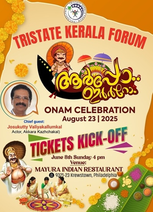 ഓഗസ്റ്റ് 23 നു ഫിലാഡൽഫിയയിൽ അരങ്ങേറുന്ന ഓണ മഹോത്സവത്തിന് മുന്നോടിയായുള്ള ടിക്കറ്റ് കിക്കോഫ് അനുബന്ധ പരിപാടിയായി നടത്തപ്പെടും.
