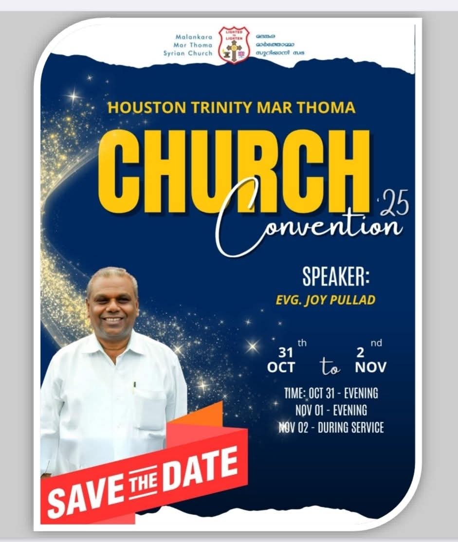 ട്രിനിറ്റി ദേവാലയത്തിൽ ( 5810, Almeda Genoa Rd, Houston , TX 77048) വച്ച് നടത്തപെടുന്ന കൺവെൻഷൻ യോഗങ്ങൾ ഇടവക ഗായകസംഘത്തിന്റെ ഗാനശുശ്രൂഷ്രയോടുകൂടി വൈകുന്നേരം 7 മണിയ്ക്ക് ആരംഭിയ്ക്കും.