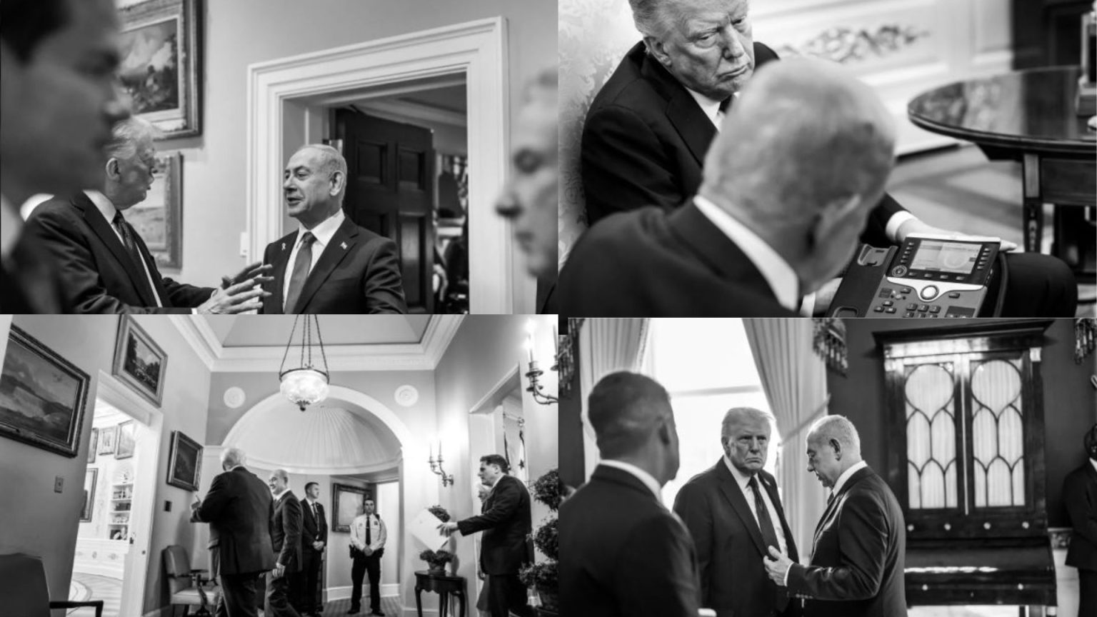 ഡൊണാൾഡ് ട്രംപിൻറെ കയ്യിൽ ഫോൺ, റിസീവർ നെതന്യാഹുവിന്റെ കാതിൽ. കടലാസ് നോക്കി ഖത്തർ ഭരണാധികാരിയോട് മാപ്പ് പറയുന്ന ഇസ്രായേൽ പ്രധാനമന്ത്രി. ഗാസയ്ക്കുള്ള യുഎസ് സമാധാന പദ്ധതി പ്രഖ്യാപിച്ചുകൊണ്ട് അമേരിക്കൻ പ്രസിഡന്റ് ഡൊണാൾഡ് ട്രംപും ഇസ്രായേൽ പ്രധാനമന്ത്രി ബെഞ്ചമിൻ നെതന്യാഹുവും തമ്മിലുള്ള കൂടികാഴ്ചക്കിടെയുള്ള ബ്ലാക് ആൻഡ് വൈറ്റ് ചിത്രങ്ങൾ സാമൂഹ്യ മാധ്യമങ്ങളിൽ ചർച്ചയാകുന്നു. വൈറ്റ്ഹൗസ് തന്നെയാണ് ചിത്രങ്ങൾ പുറത്ത് വിട്ടത്.