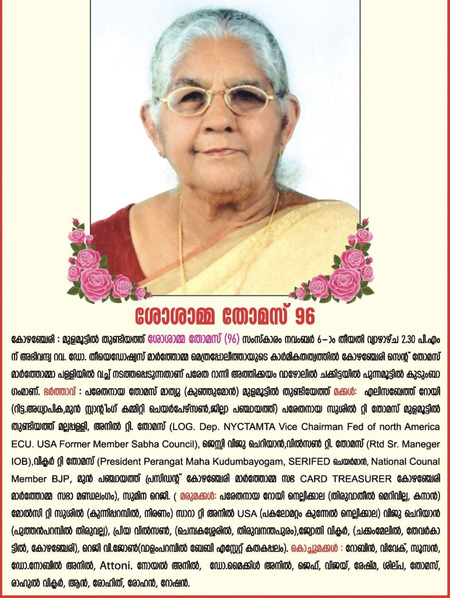 സെറിഫെഡ് ചെയര്മാനും ബിജെപി ദേശീയ നിർവാഹ സമിതി അംഗവുമായ വിക്ടര് ടി. തോമസിന്റെ മാതാവ് ശോശാമ്മ തോമസ് (96) നിര്യാതയായി പരേത റാന്നി അത്തിക്കയം വാഴോലില് ചക്കിട്ടയില് പുന്നമൂട്ടില് കുടുംബാംഗമാണ്. സംസ്കാരം പിന്നീട്. ഭര്ത്താവ് കോഴഞ്ചേരി മുളമൂട്ടില് തുണ്ടിയത്ത് കുടുംബാംഗം പരേതനായ തോമസ് മാത്യു (കുഞ്ഞുമോന്).