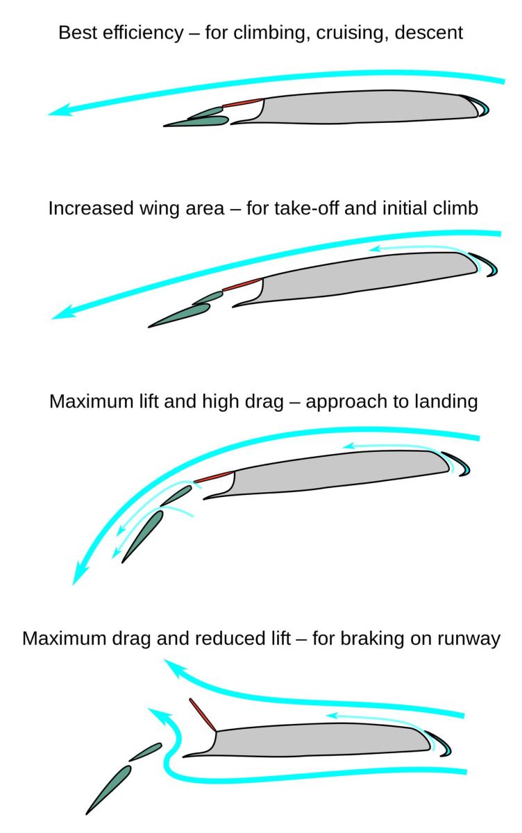 അവസാനമായി ഫ്ലാപ്പുകൾ എന്താണെന്നു കൂടി പറഞ്ഞ് നിർത്താം. വിമാനചിറകുകളുടെ പിന്നറ്റത്തായി, ആവശാനുസരണം താഴേക്ക് അലപ്ം വളച്ച് ഇറക്കിവയ്ക്കാനാവുന്ന ഹൈഡ്റോളീക് നിയന്ത്രിത തകിടുകളാണ് ഫ്ലാപ്പുകൾ. ഇവയുടെ പ്രധാന ഉപയോഗം ചിറകുകളുടെ കർവ് , കൂട്ടുക എന്നതാണ്. ലാൻ്റിംഗിലും ടേക്ക്ക് ഓഫിലും വിമാനത്തിൻ്റെ സ്പീഡ് കുറവായിരിക്കും. ഇങ്ങനെ സ്പീഡ് കുറവായിരിക്കുന്ന സമയത്തും ആവശ്യത്തിന് ലിഫ്റ്റ് നൽകാനായി രണ്ട് കാര്യങ്ങൾ ചെയ്യാം, ഈ തകിടുകൾ ചിറകിൻ്റെ പിന്നിലേക്ക് നീട്ടിക്കൊണ്ട് ചിറകിൻ്റെ ഏരിയ അല്പം കൂടി കൂട്ടാം, ഒപ്പം ഈ തകിടുകളെ ചെറിയ ആംഗിളിൽ താഴേക്ക് ചെരിച്ചാൽ ചിറകിൻ്റെ മുകൾഭാഗത്തുള്ള ആകെ വളവും കൂട്ടാം. (ചിത്രം മൂന്ന് നോക്കൂ)