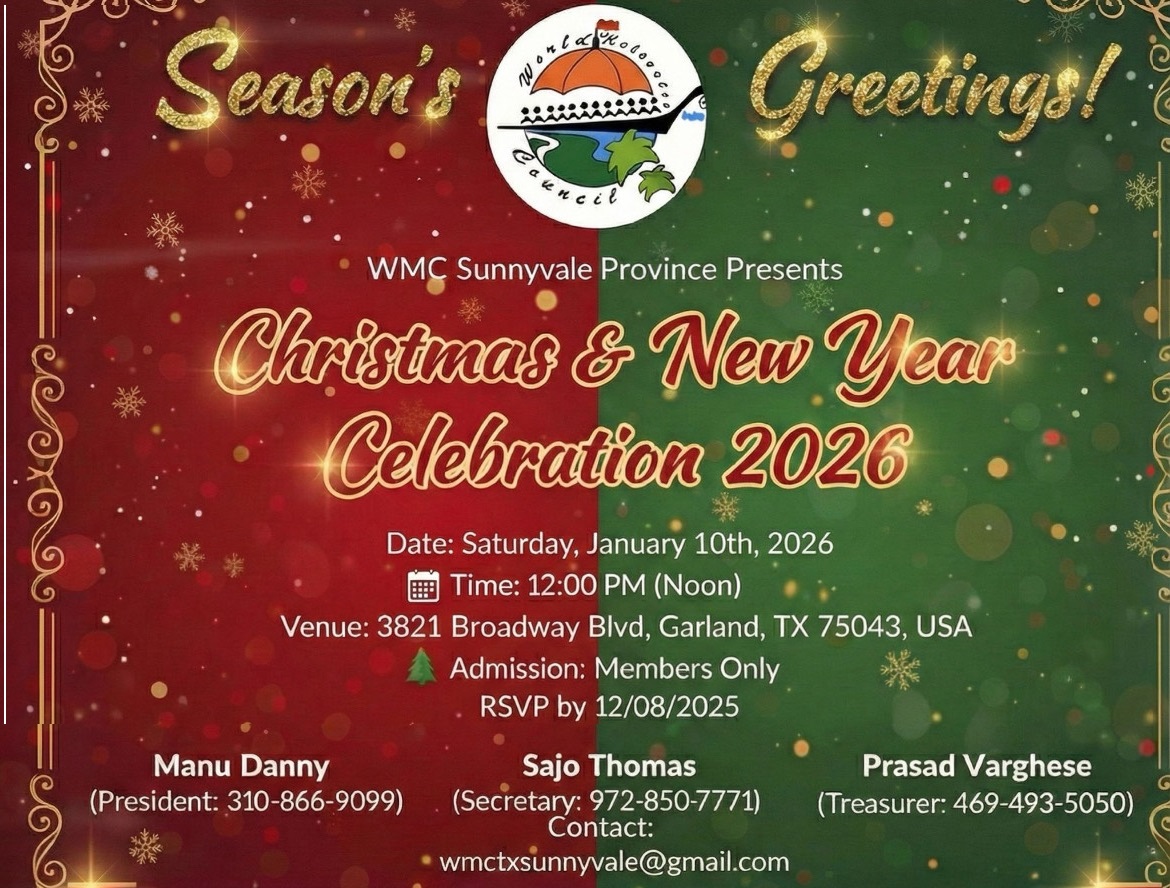 ഗാർലാൻഡ് (ടെക്സസ്): വേൾഡ് മലയാളി കൗൺസിൽ (WMC) സണ്ണി വെയ്ൽ പ്രൊവിൻസിന്റെ നേതൃത്വത്തിൽ 2026-ലെ ക്രിസ്മസ്, പുതുവത്സര ആഘോഷങ്ങൾ വിപുലമായ പരിപാടികളോടെ സംഘടിപ്പിക്കുന്നു. ജനുവരി 10 ശനിയാഴ്ച ഉച്ചയ്ക്ക് 12 മണിക്ക് ഗാർലാൻഡിലുള്ള മനോഹരമായ വേദിയിൽ വെച്ചാണ് (3821 Broadway Blvd, Garland, TX 75043) ആഘോഷങ്ങൾ നടക്കുന്നത്.